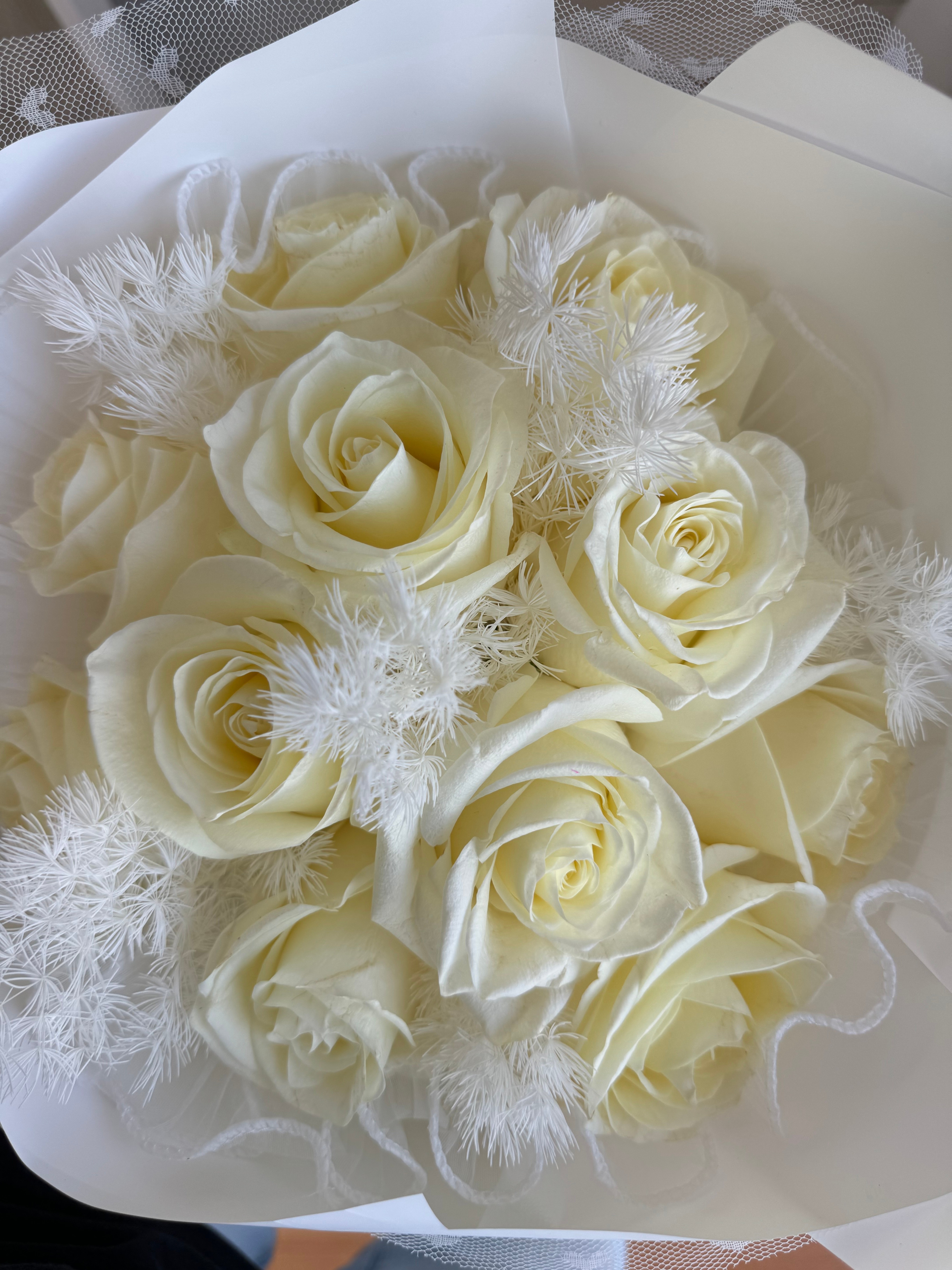 花材:11枝厄瓜多尔玫白玫瑰,白色德国松永生花