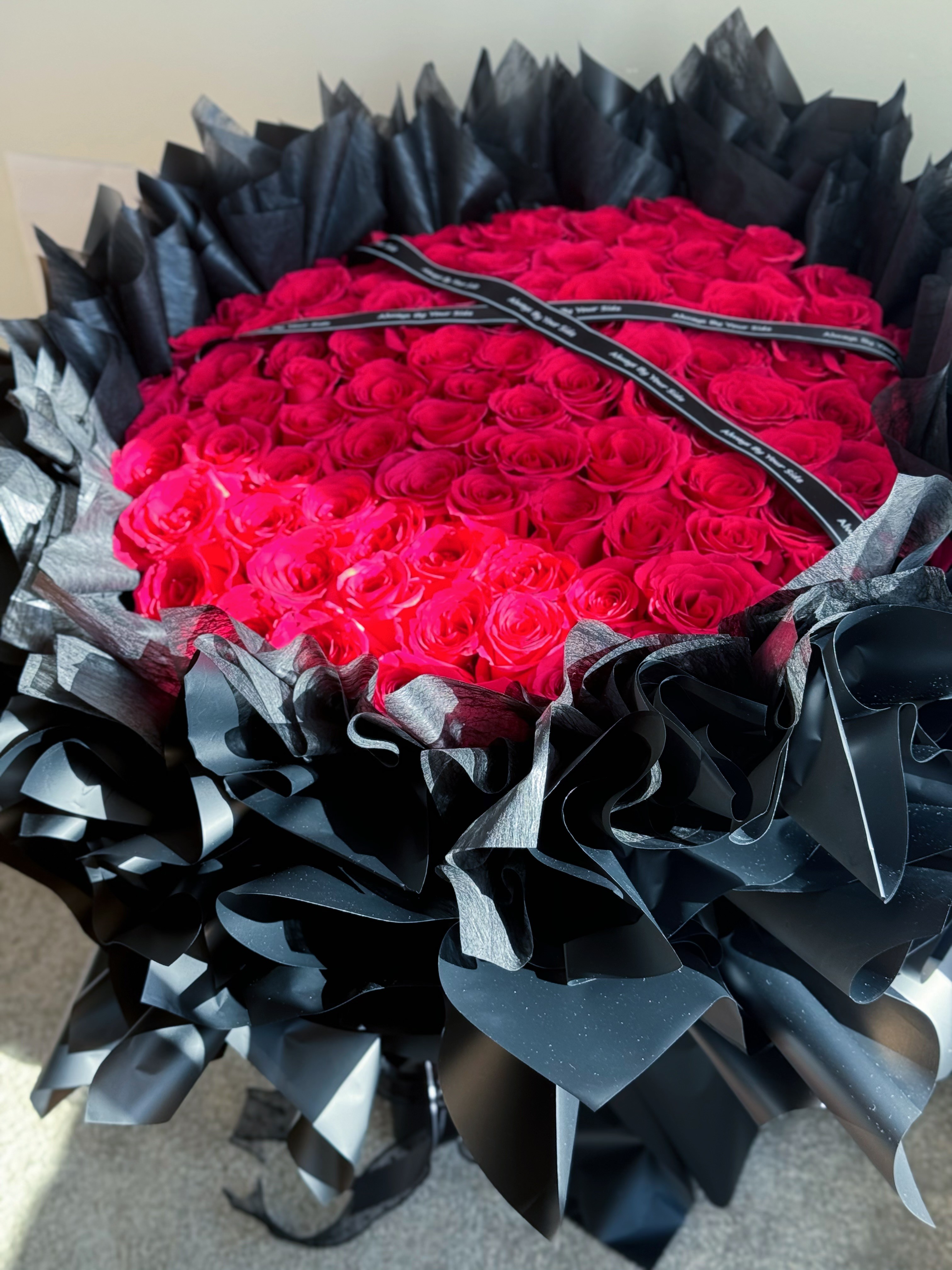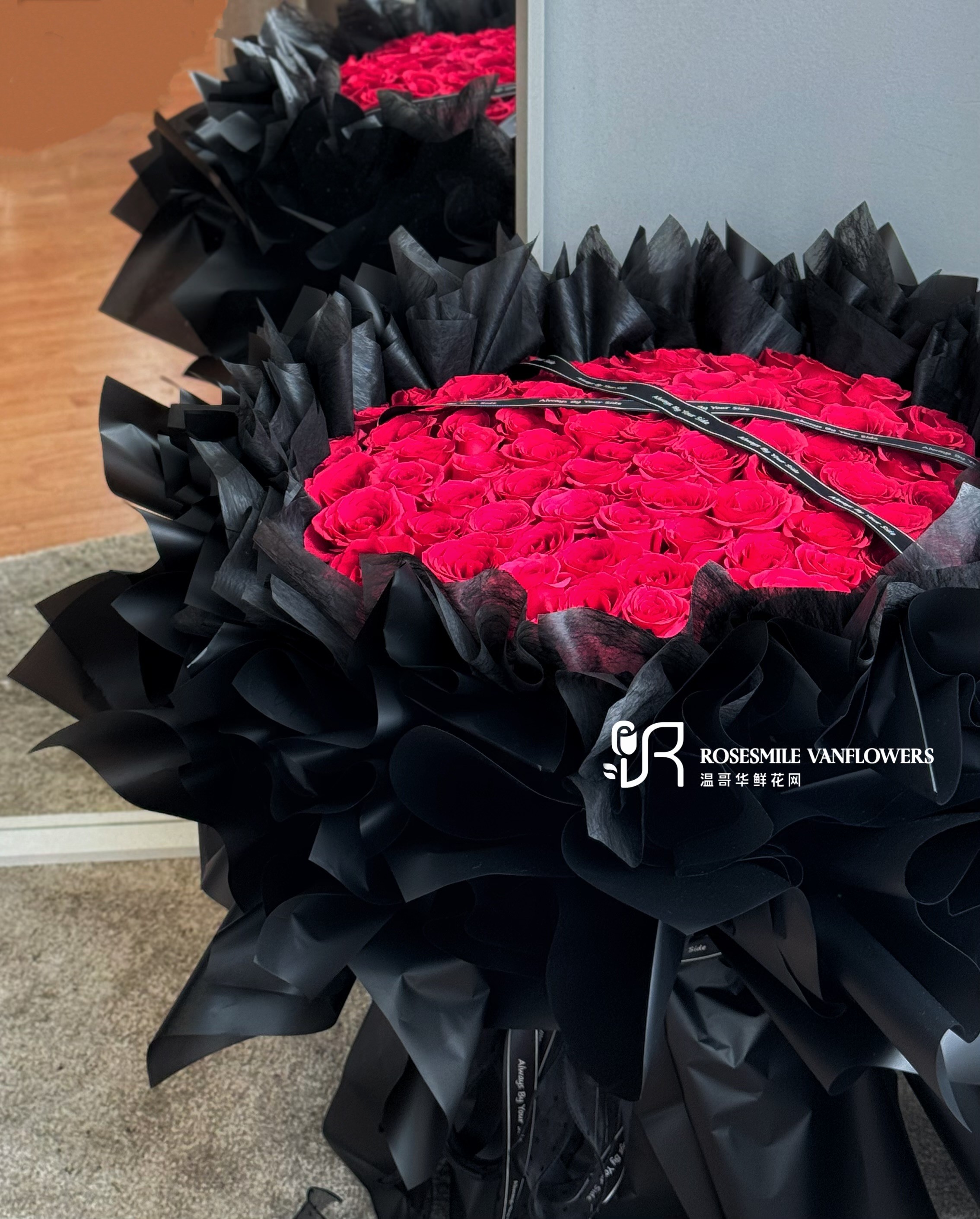 包装:圆形精包装花束,黑色巨型花束包装,配色蝴蝶结。(也可换您心仪的其他外包装颜色,协调配色包装)