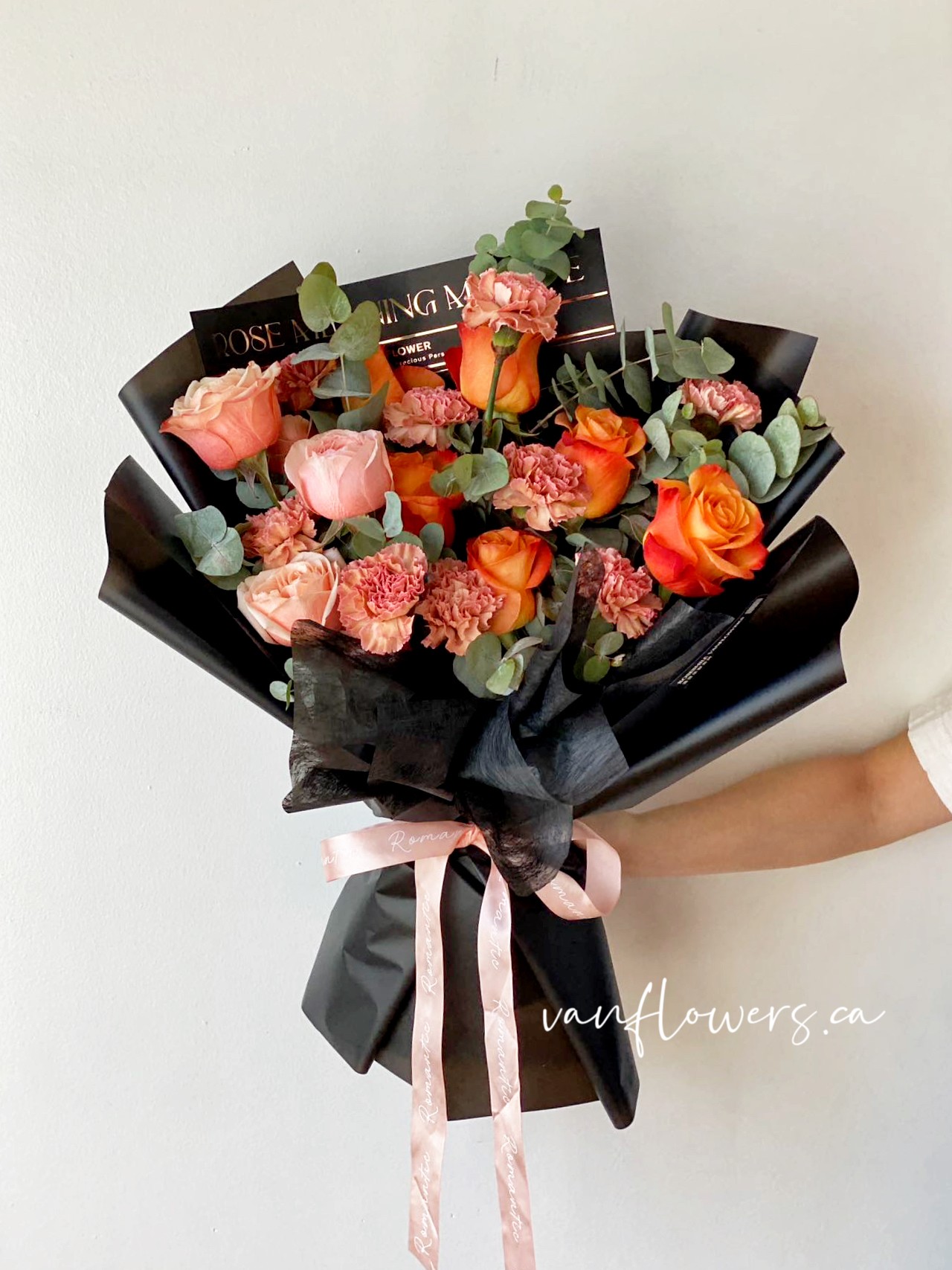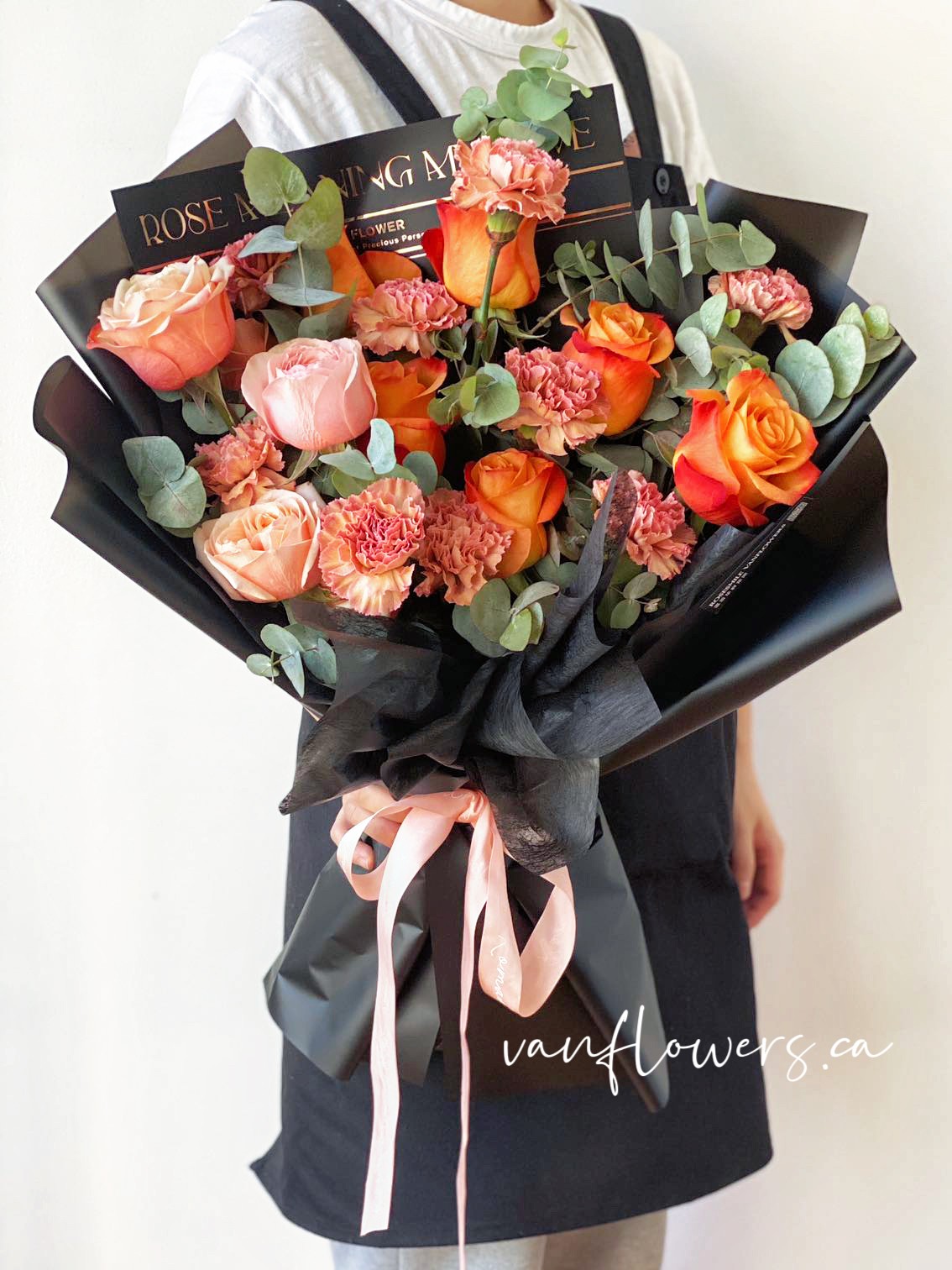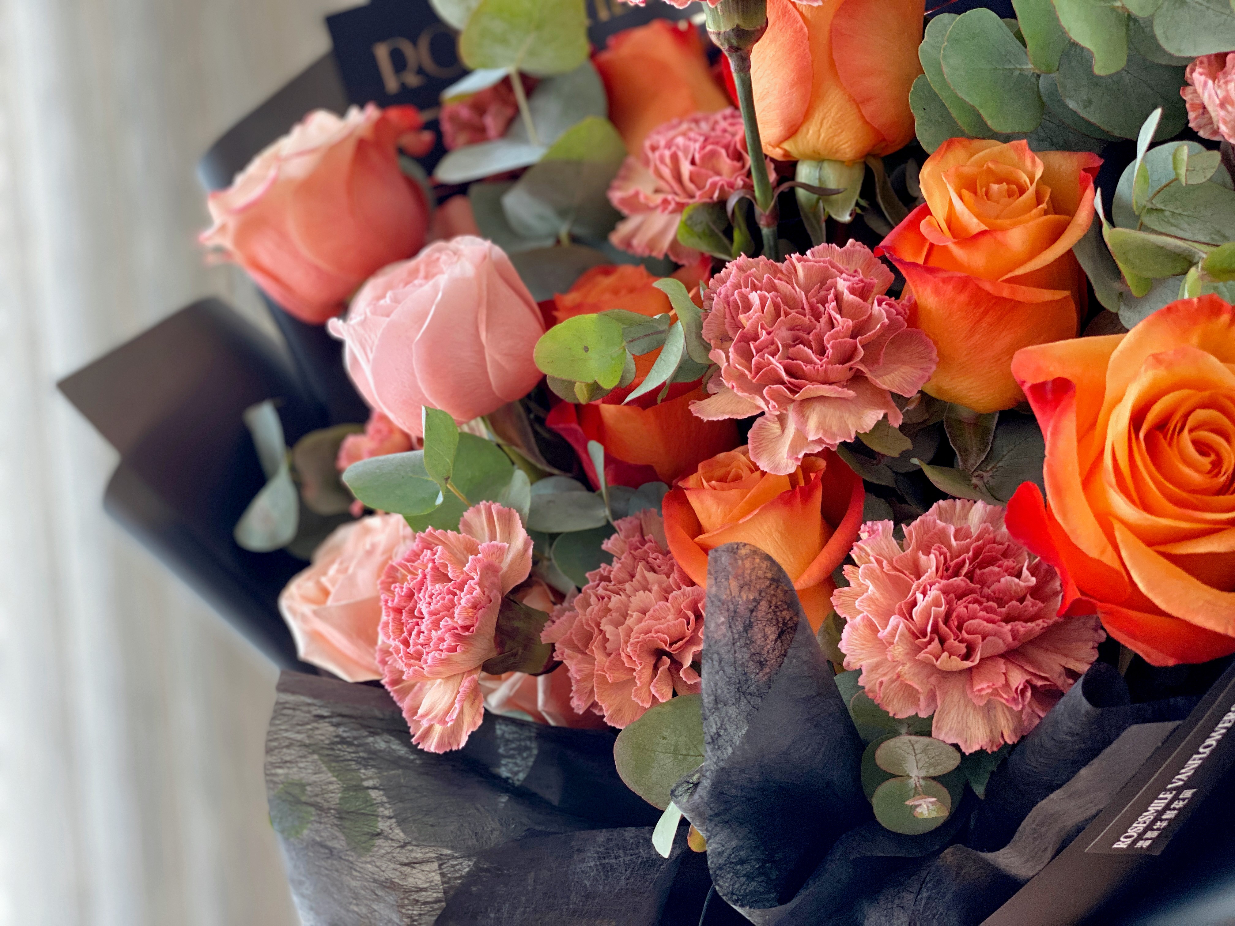 花材:peach玫瑰3枝,橙色玫瑰6枝,复古康乃馨9枝,尤加利叶