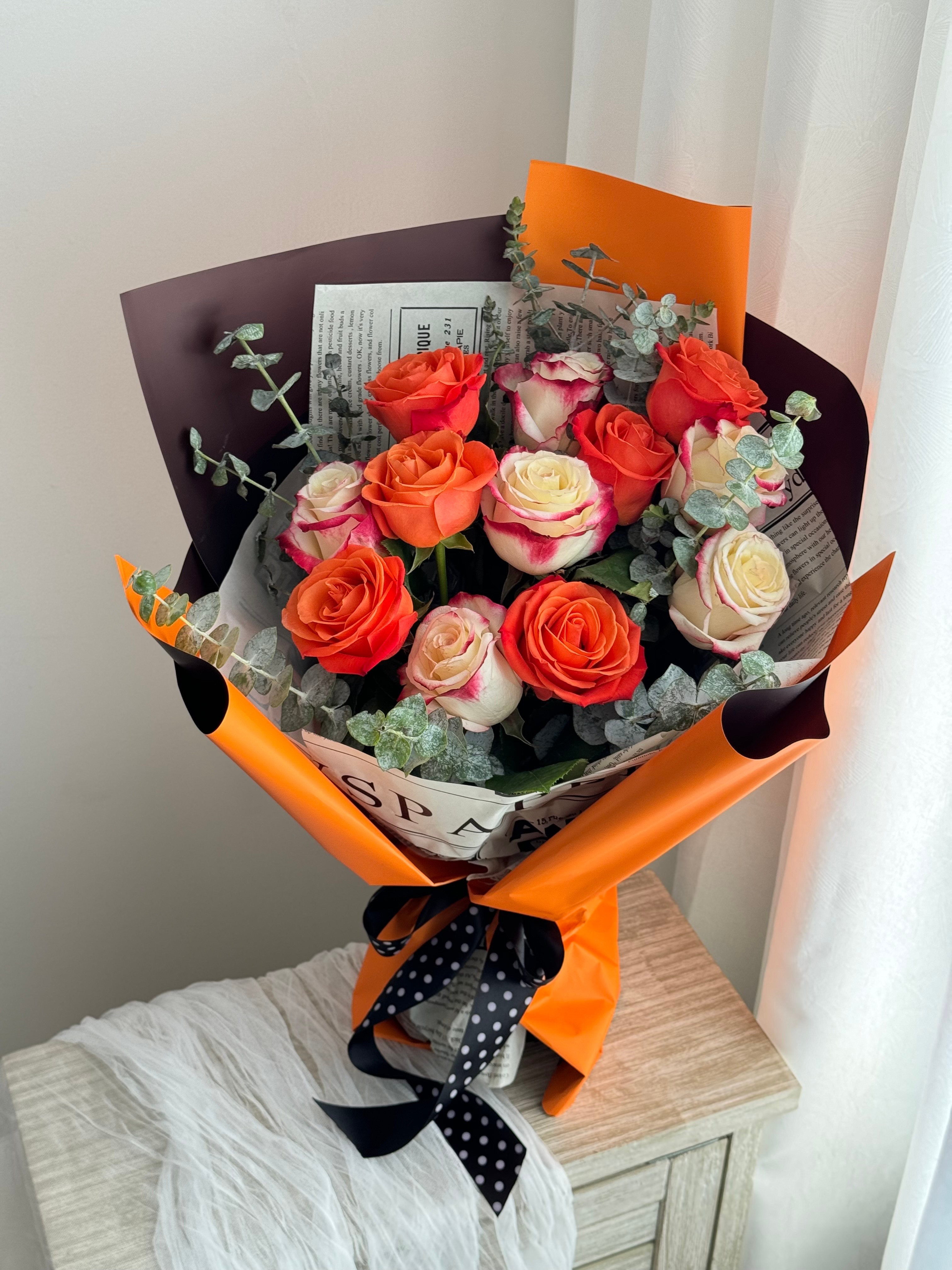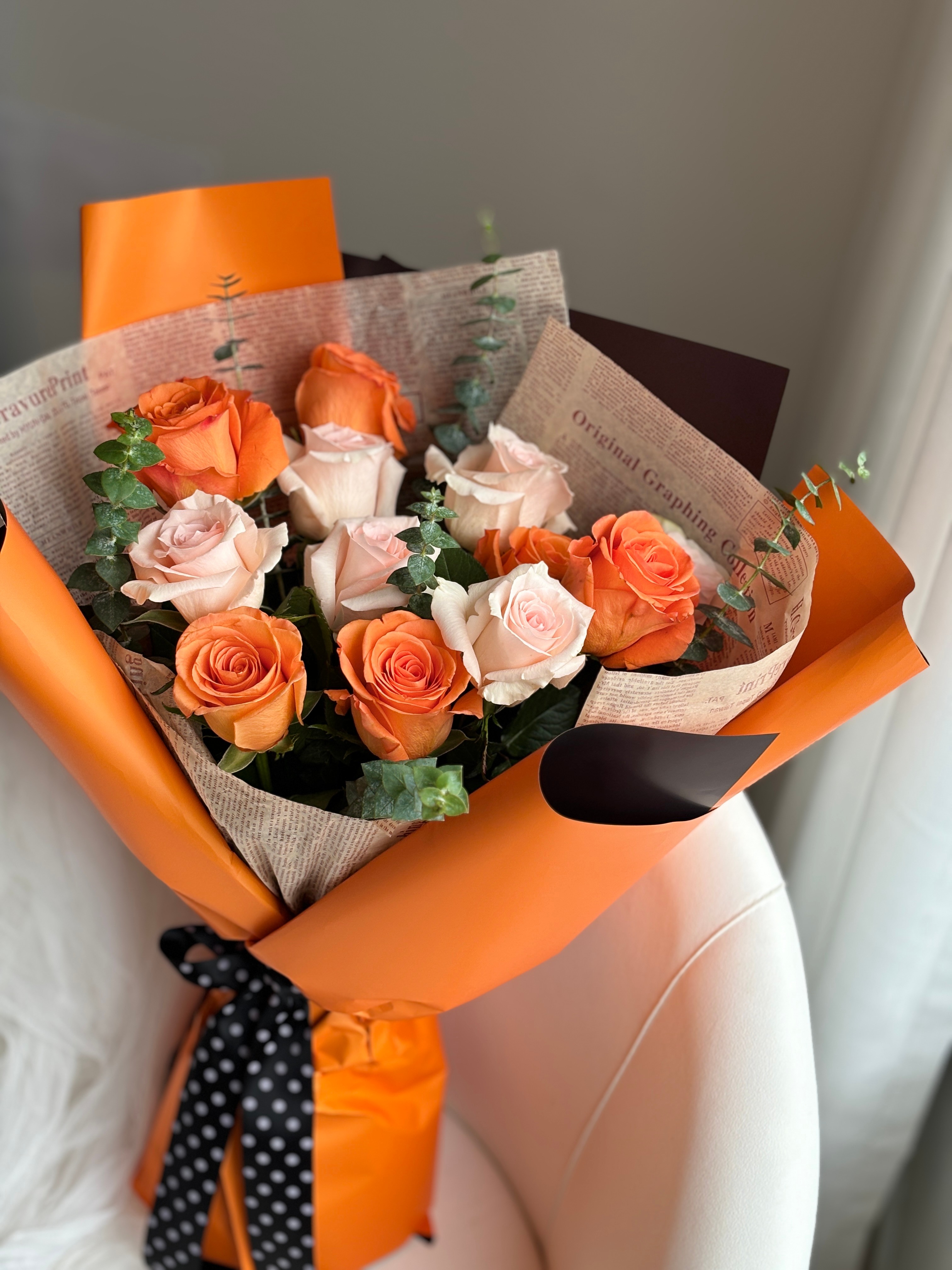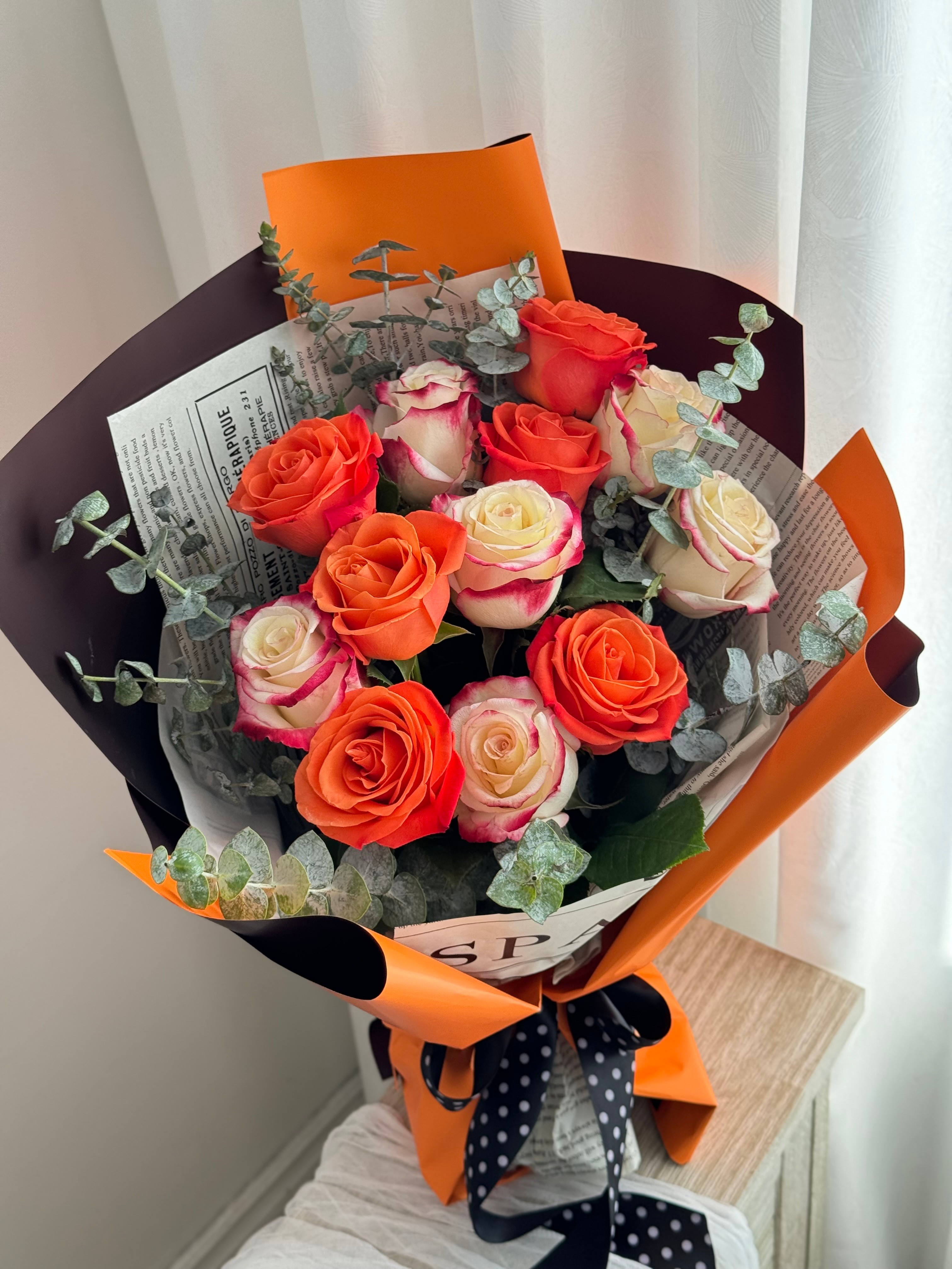 花材:12枝双拼蜜桃、甜橙玫瑰,尤加利叶