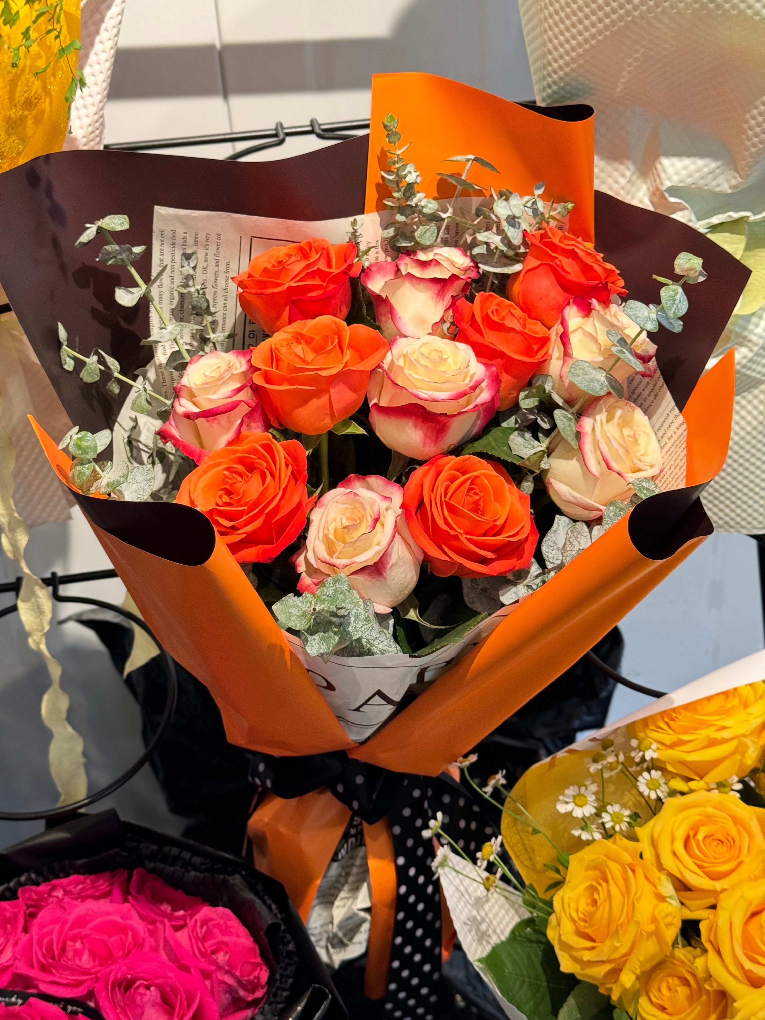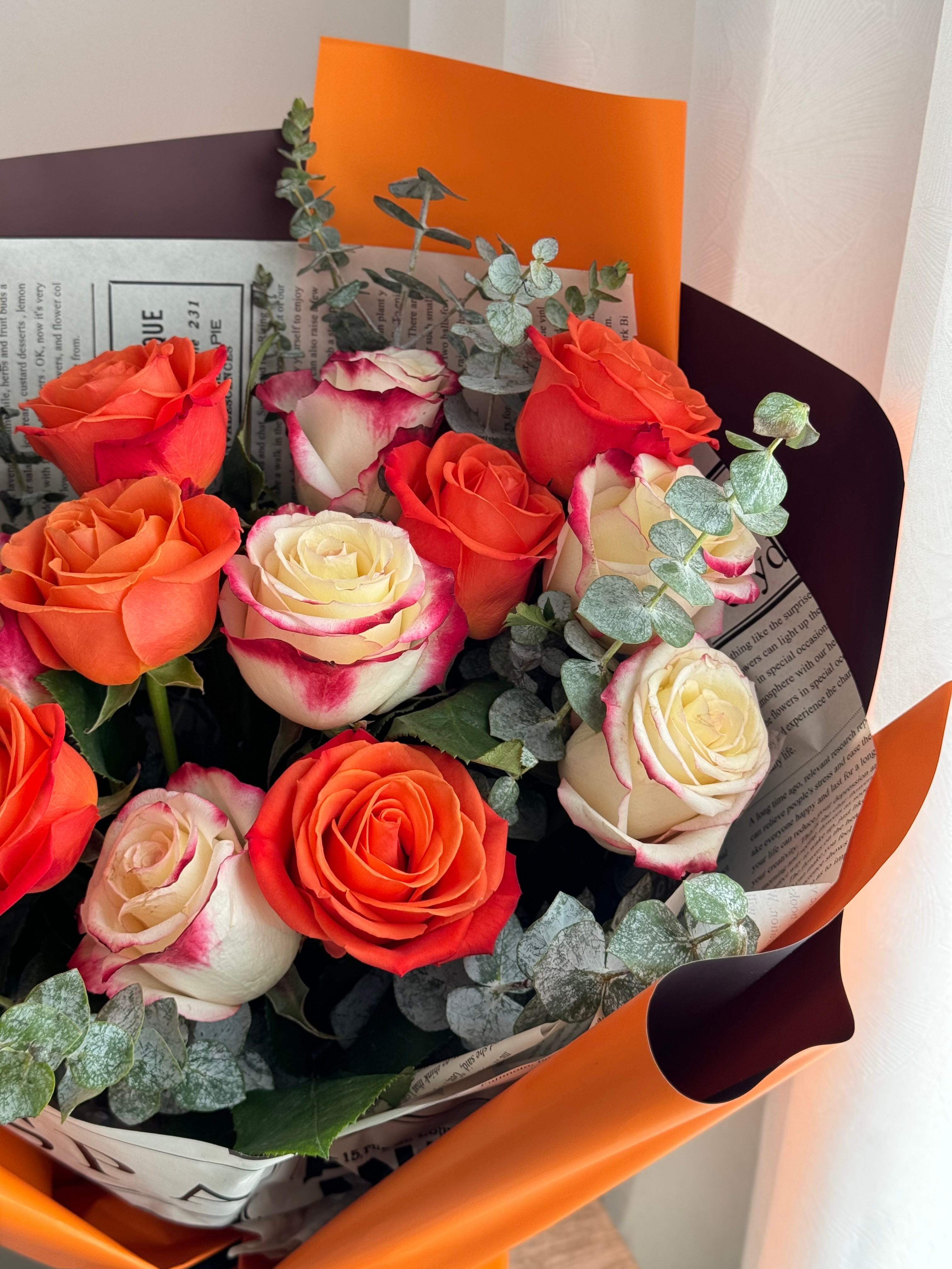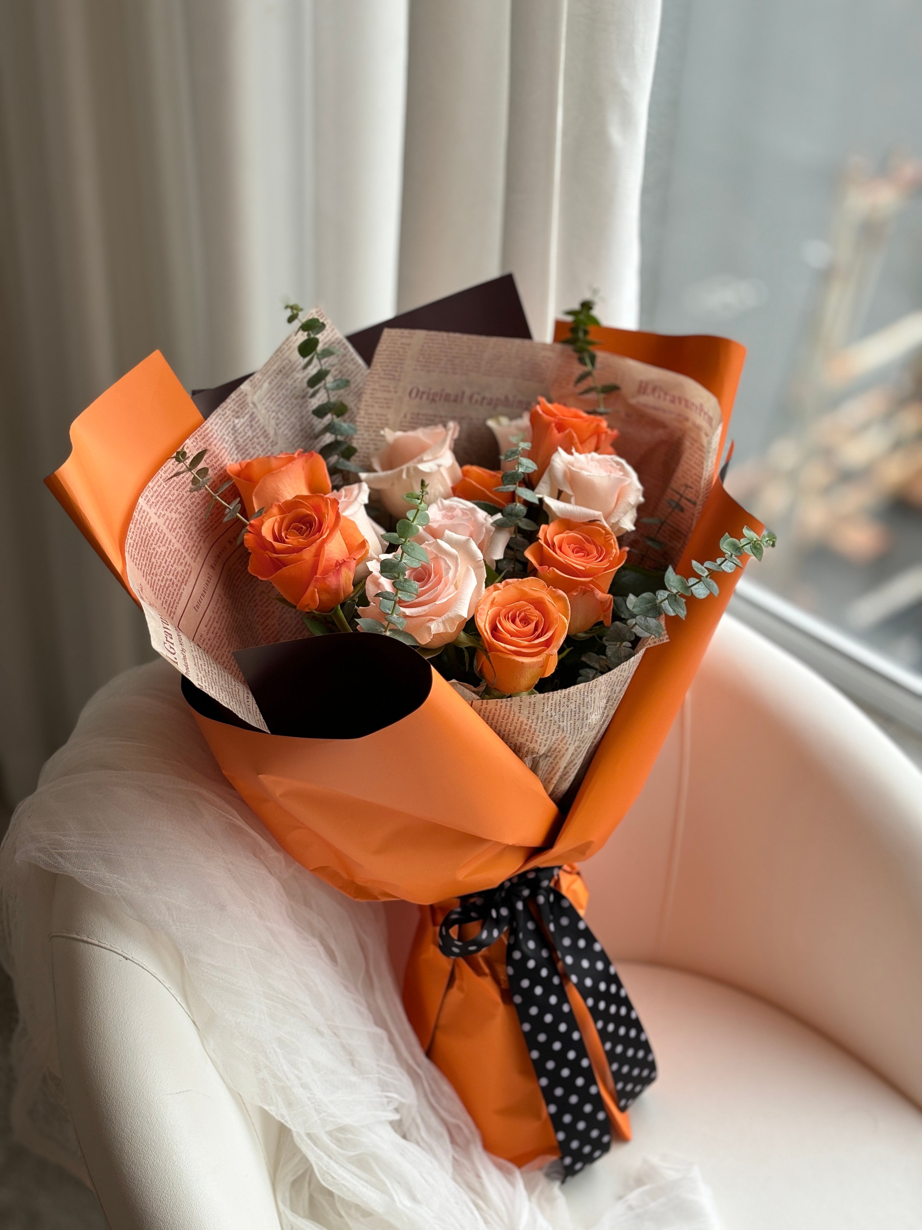 花材:12枝双拼蜜桃、甜橙玫瑰,尤加利叶
