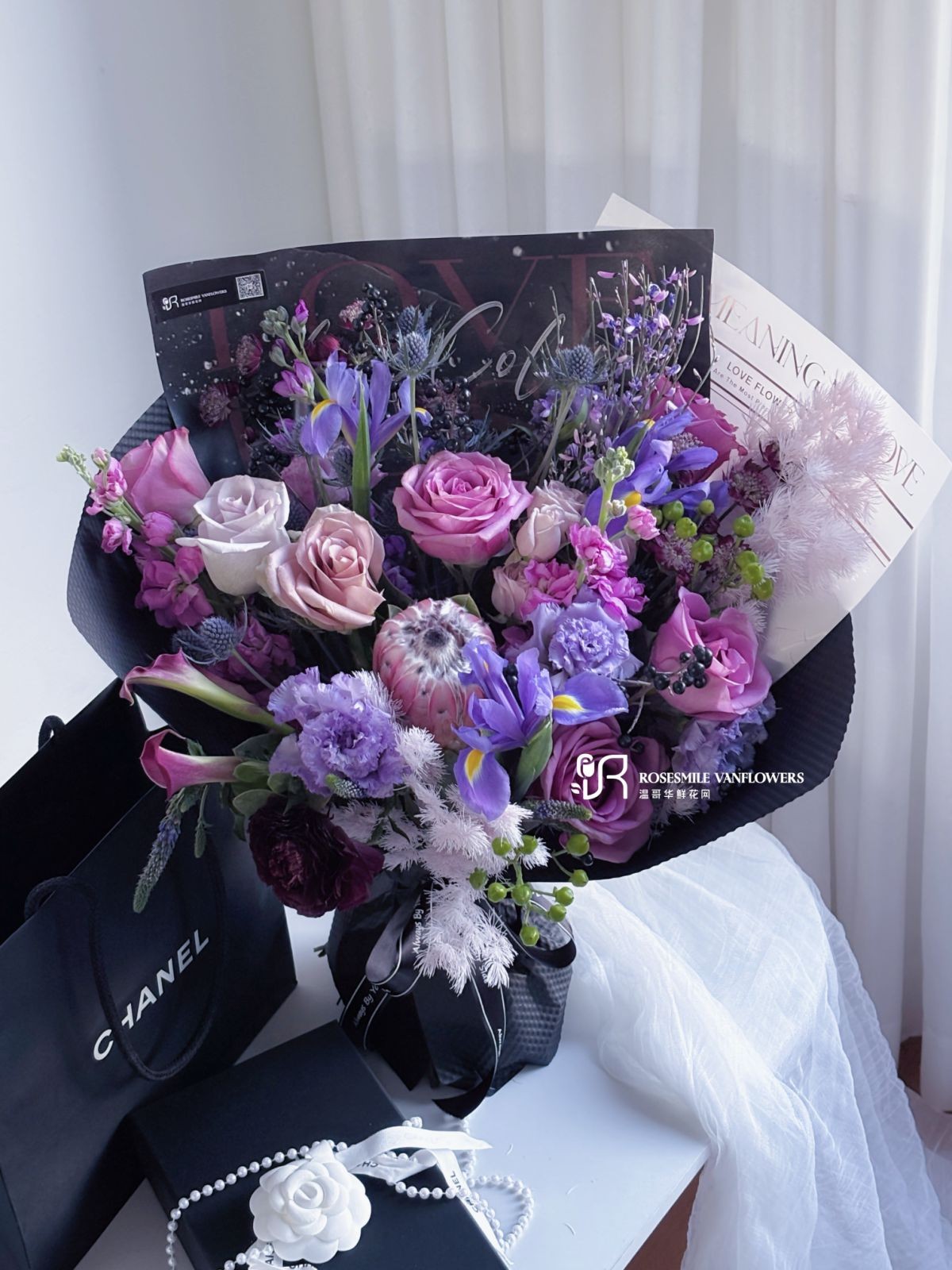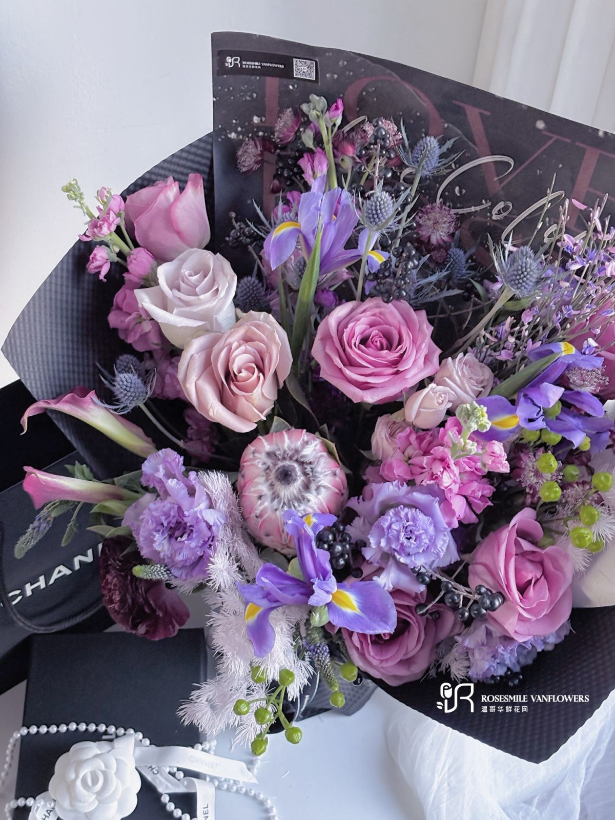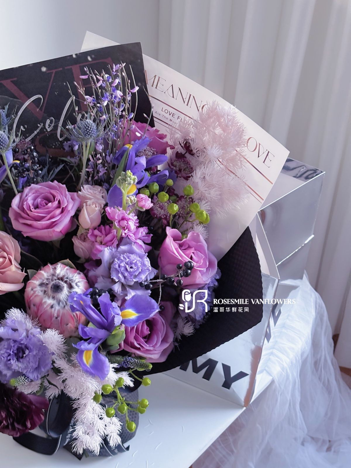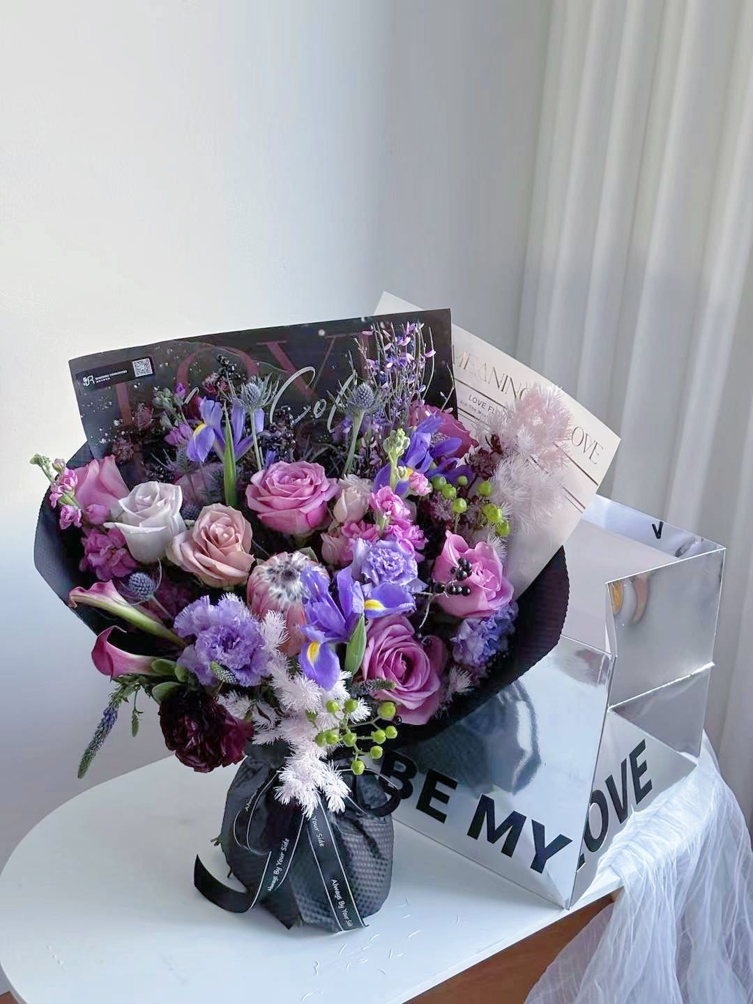 花材:紫玫瑰、鸢尾花、蓝星球、花毛茛、马蹄莲、洋桔梗、火龙珠、紫罗兰、蓬莱松(个别花材根据库存调控)