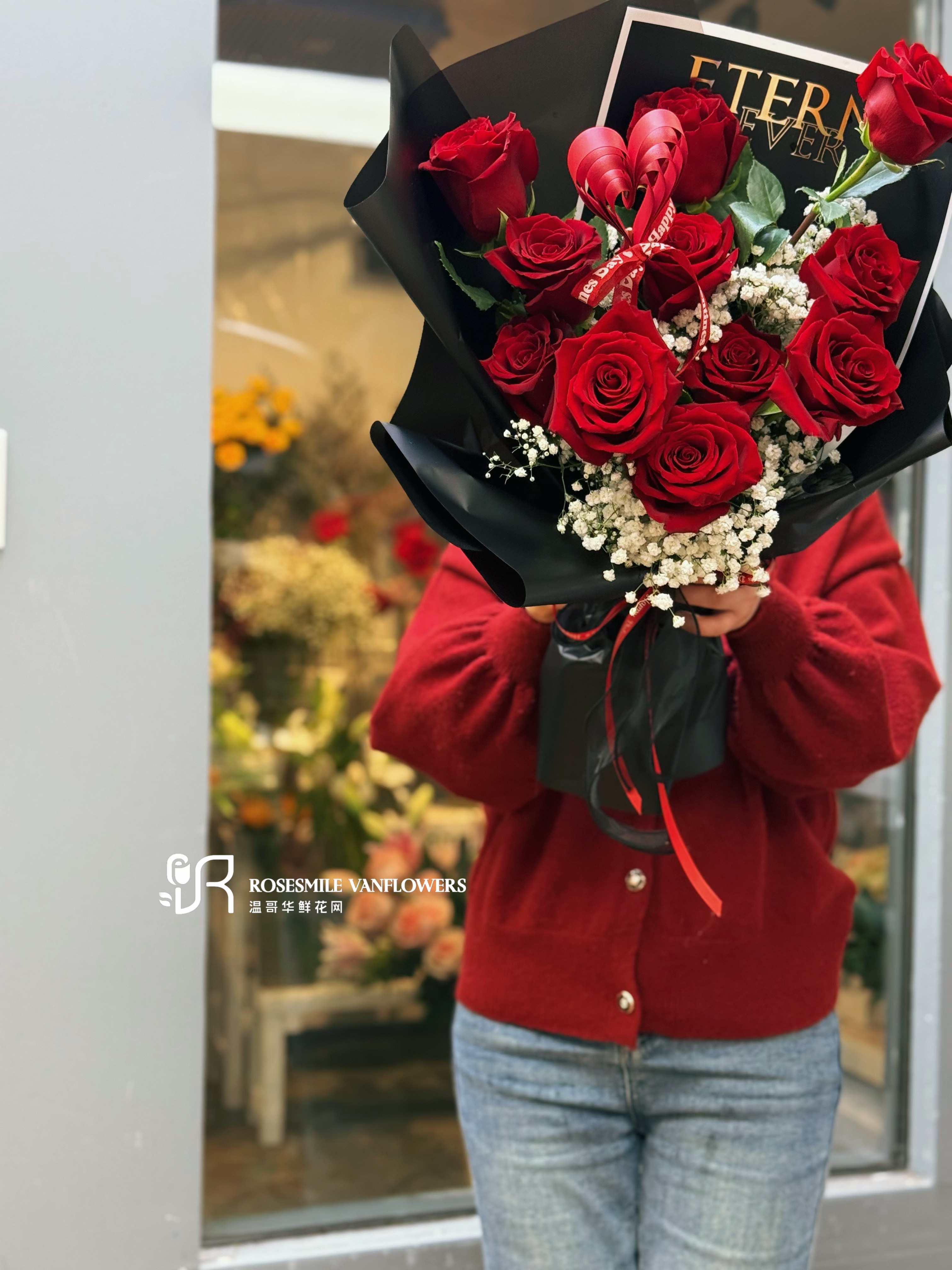 花材:11枝厄瓜多尔红玫瑰,红色情人节爱心