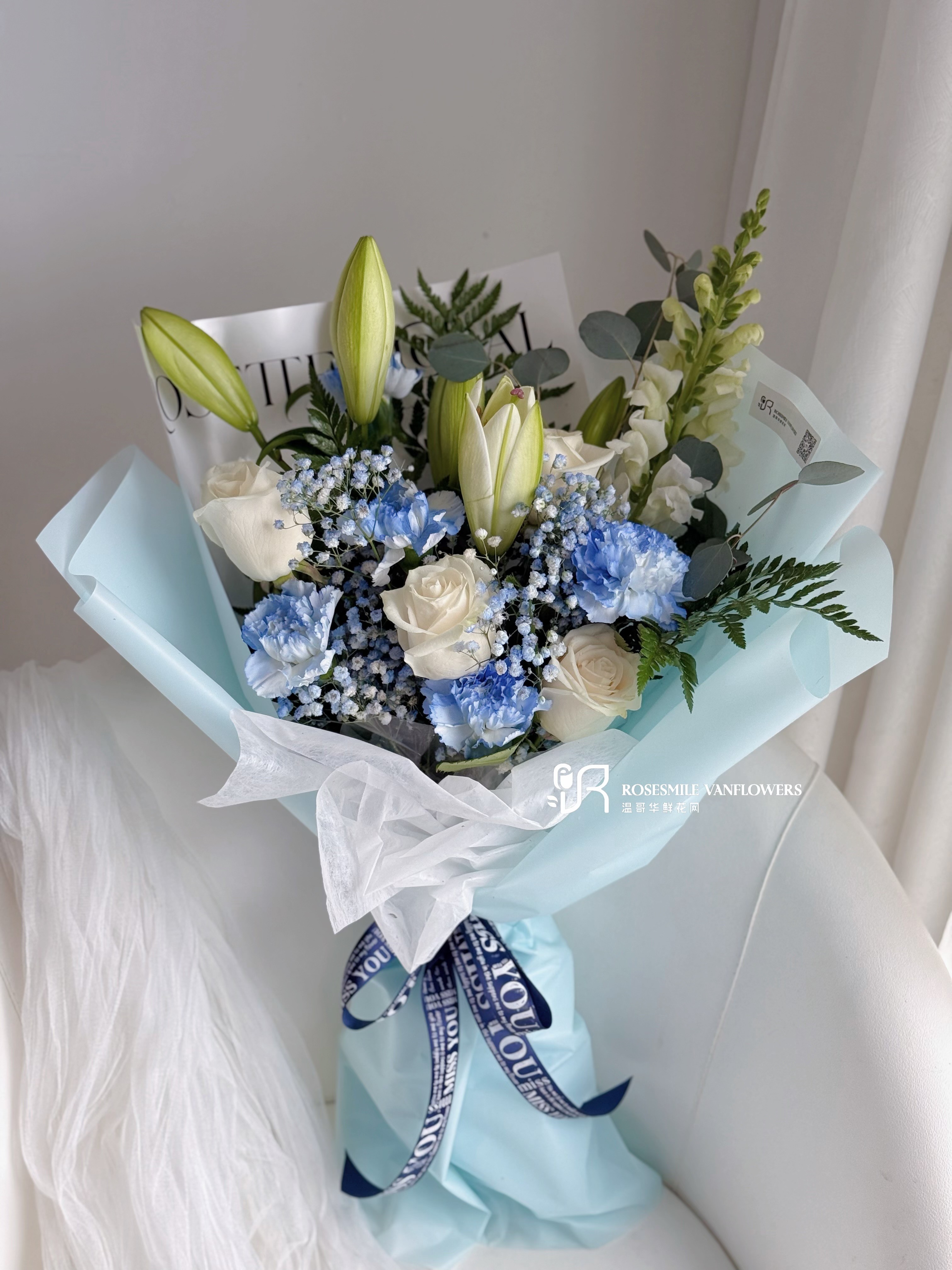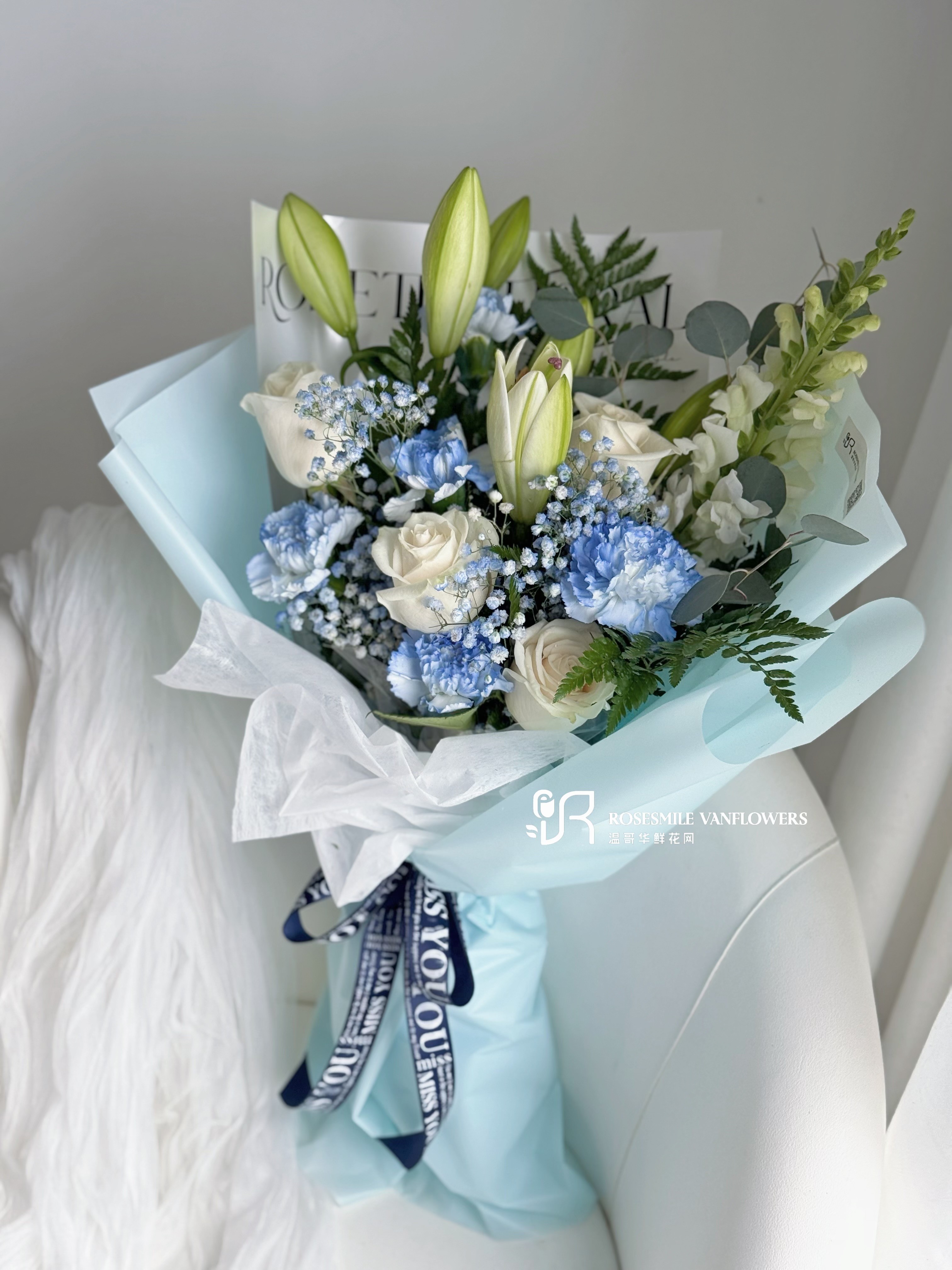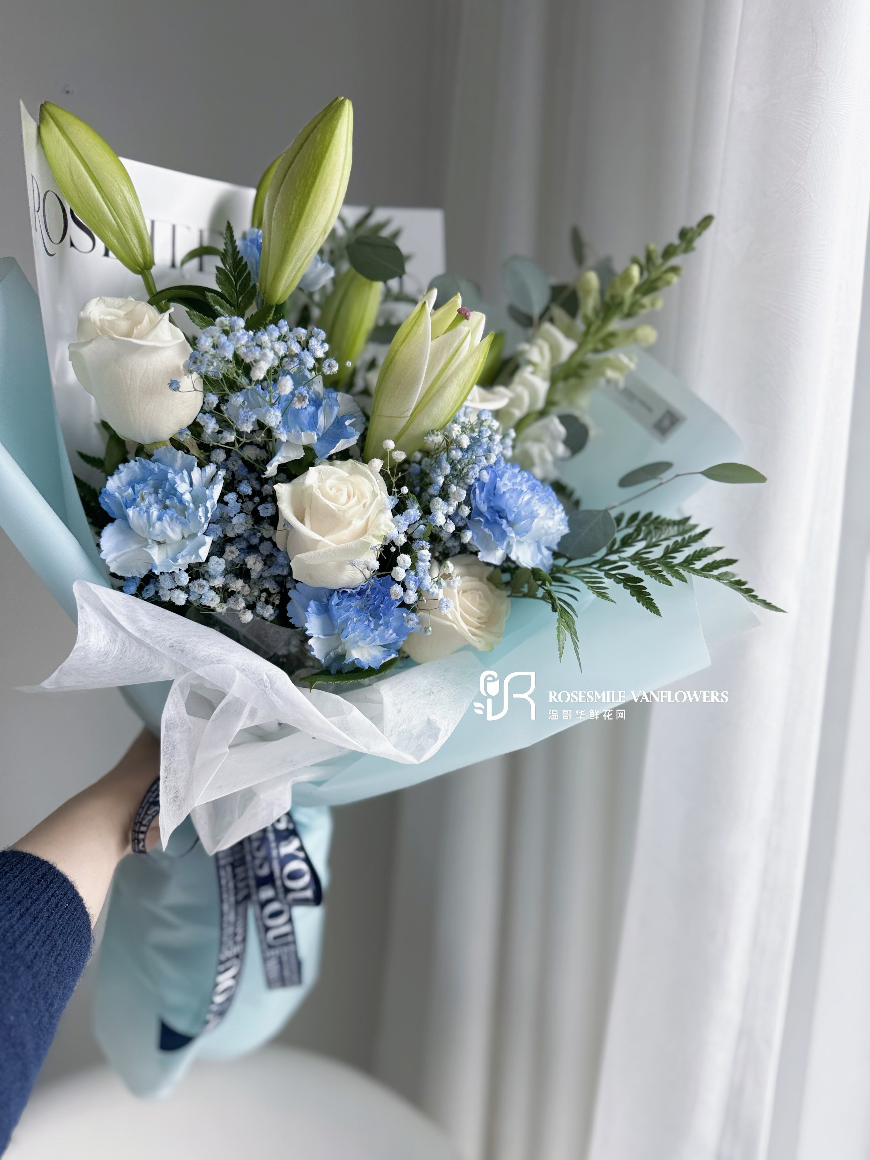 花材:白色玫瑰、白色百合、染蓝康乃馨、满天星、白色金龙草(或白色紫罗兰)等
