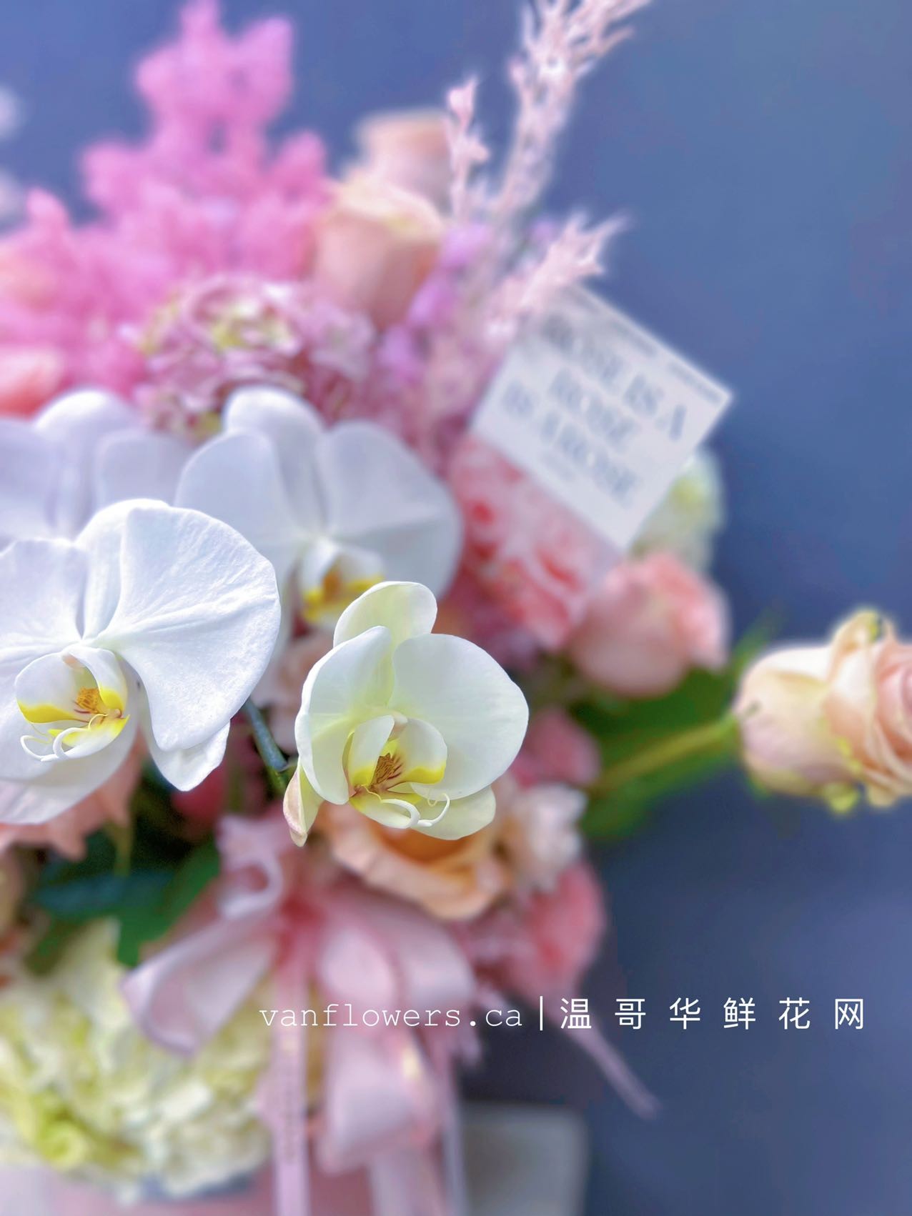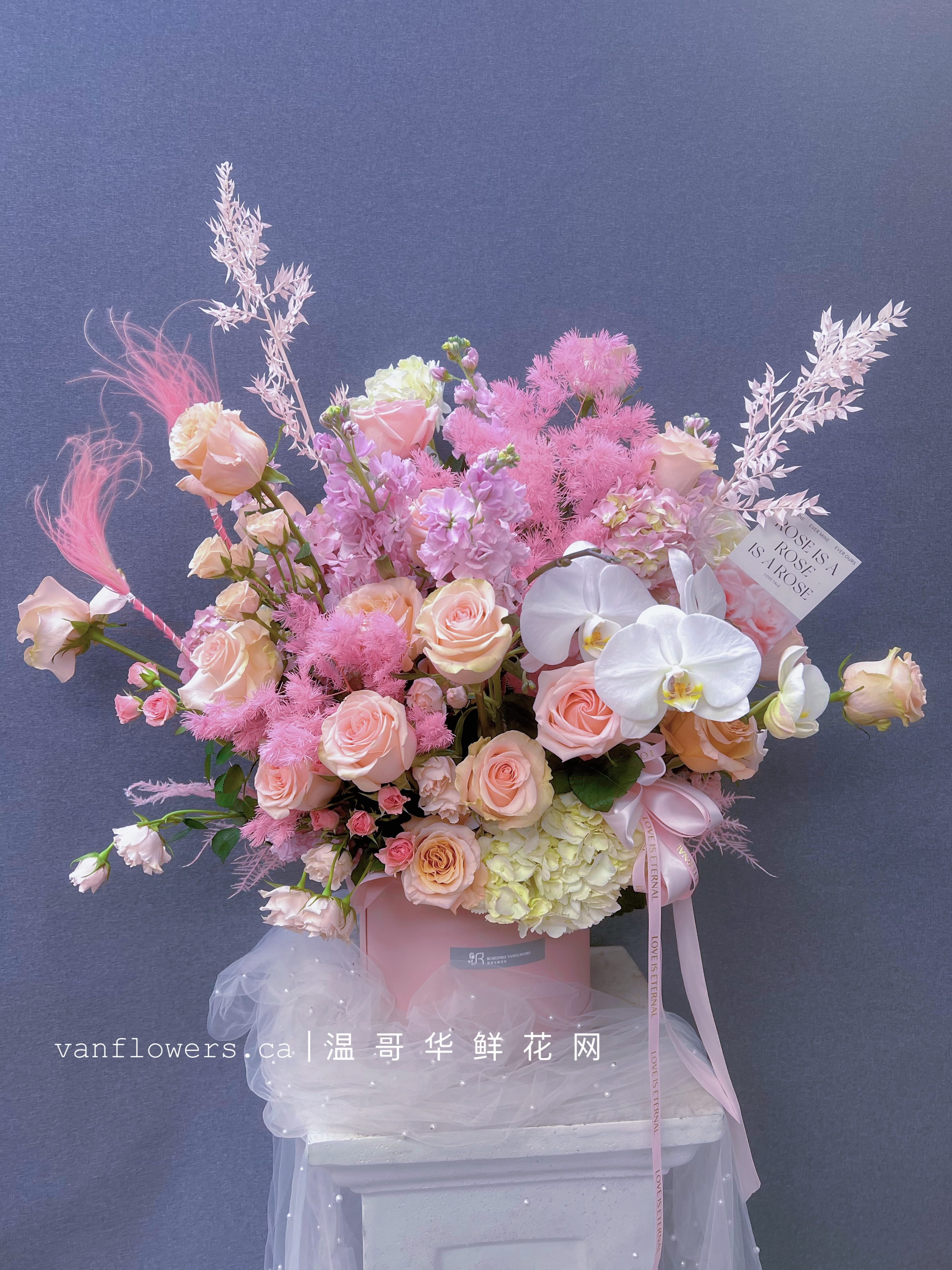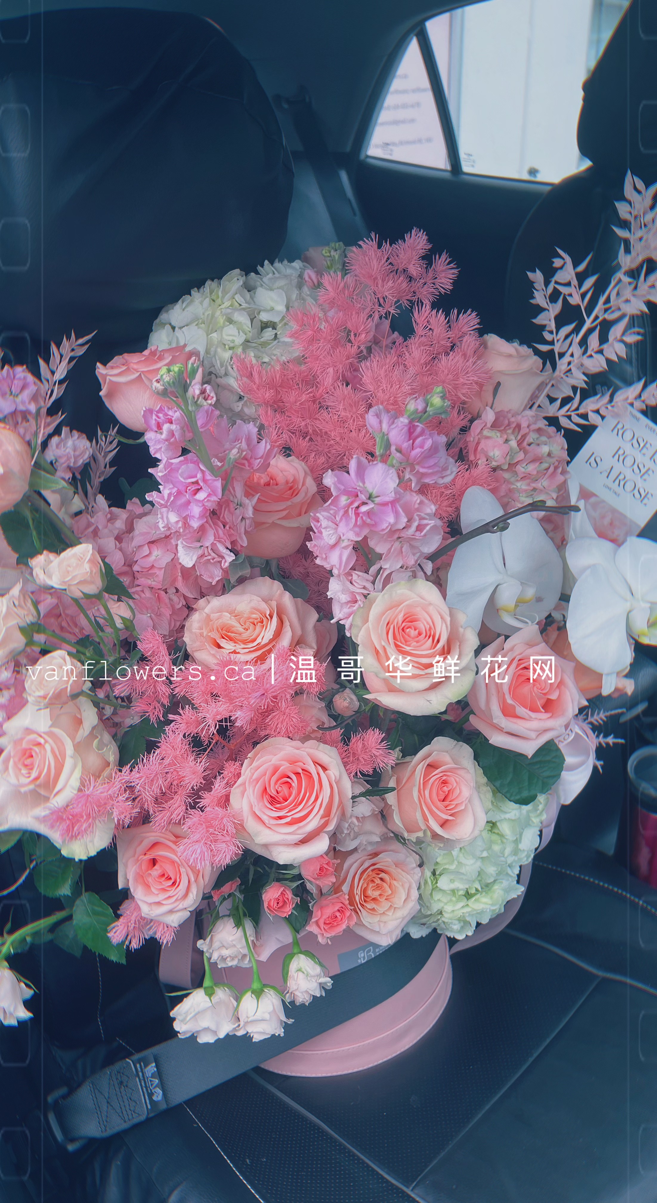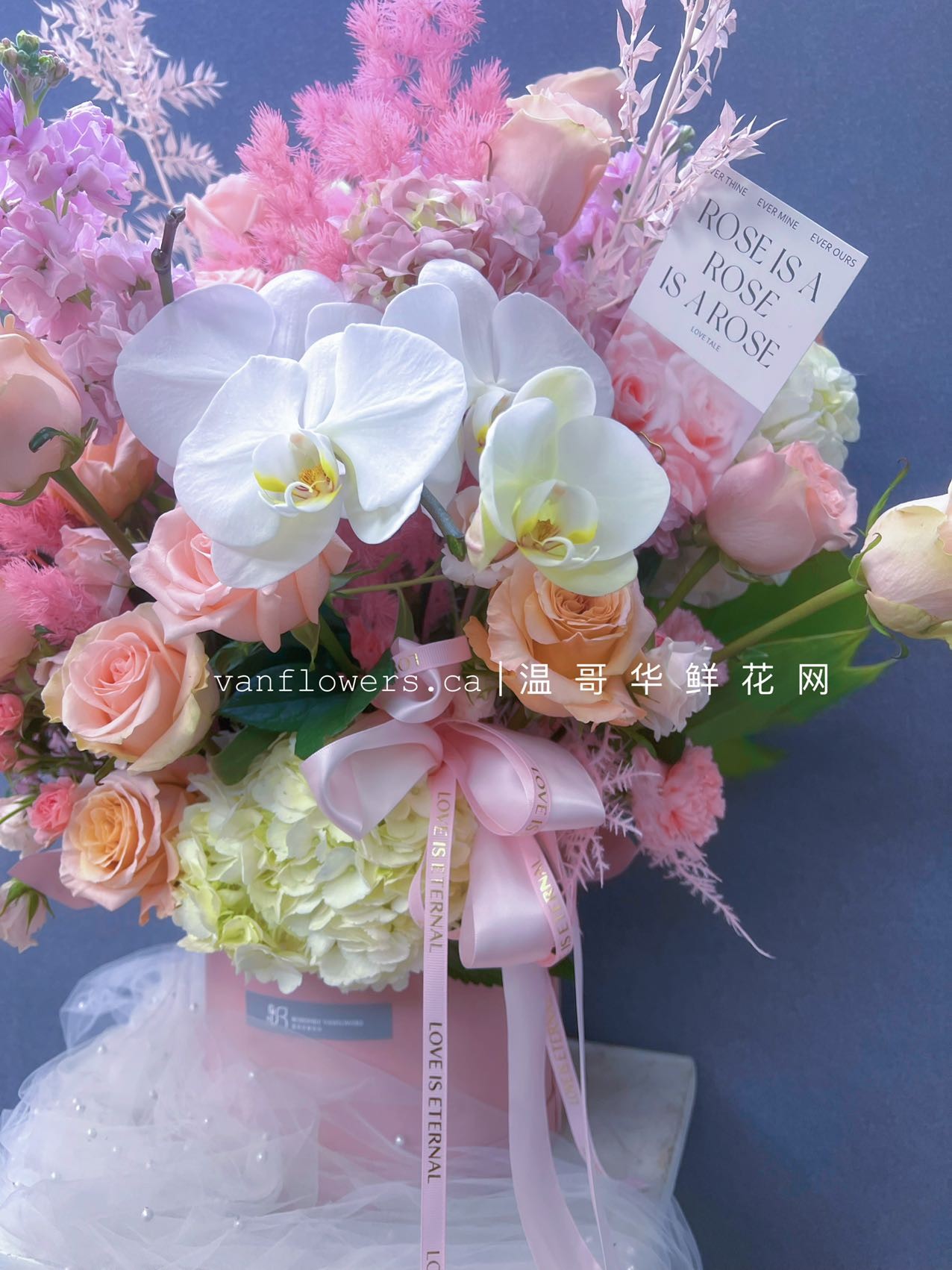 花材:22枝粉色、peach厄瓜多尔玫瑰,玉白蝴蝶兰、粉、白绣球、浪漫粉色蓬莱松、粉色、peach小玫瑰,浅粉紫罗兰、其他配花等