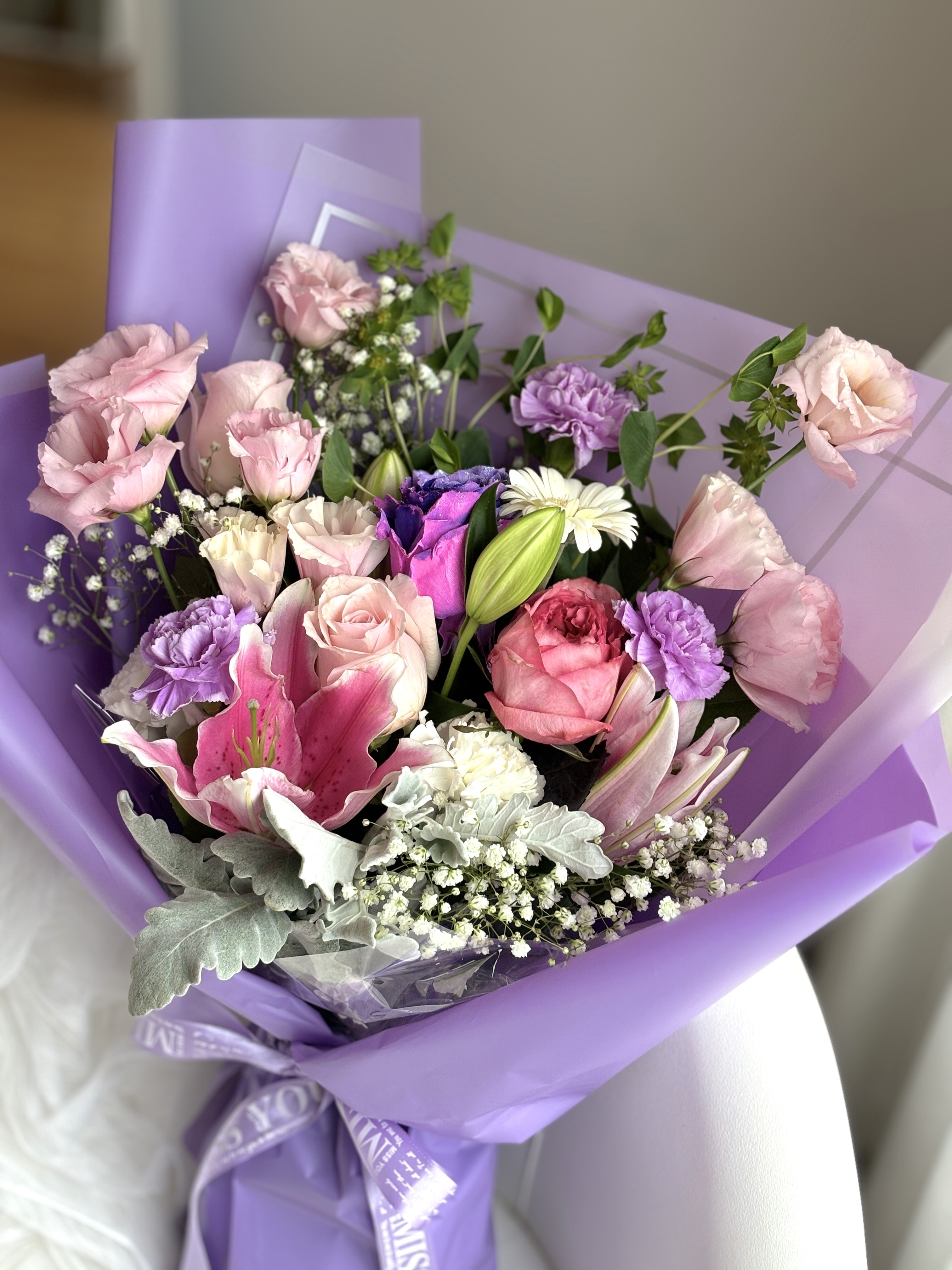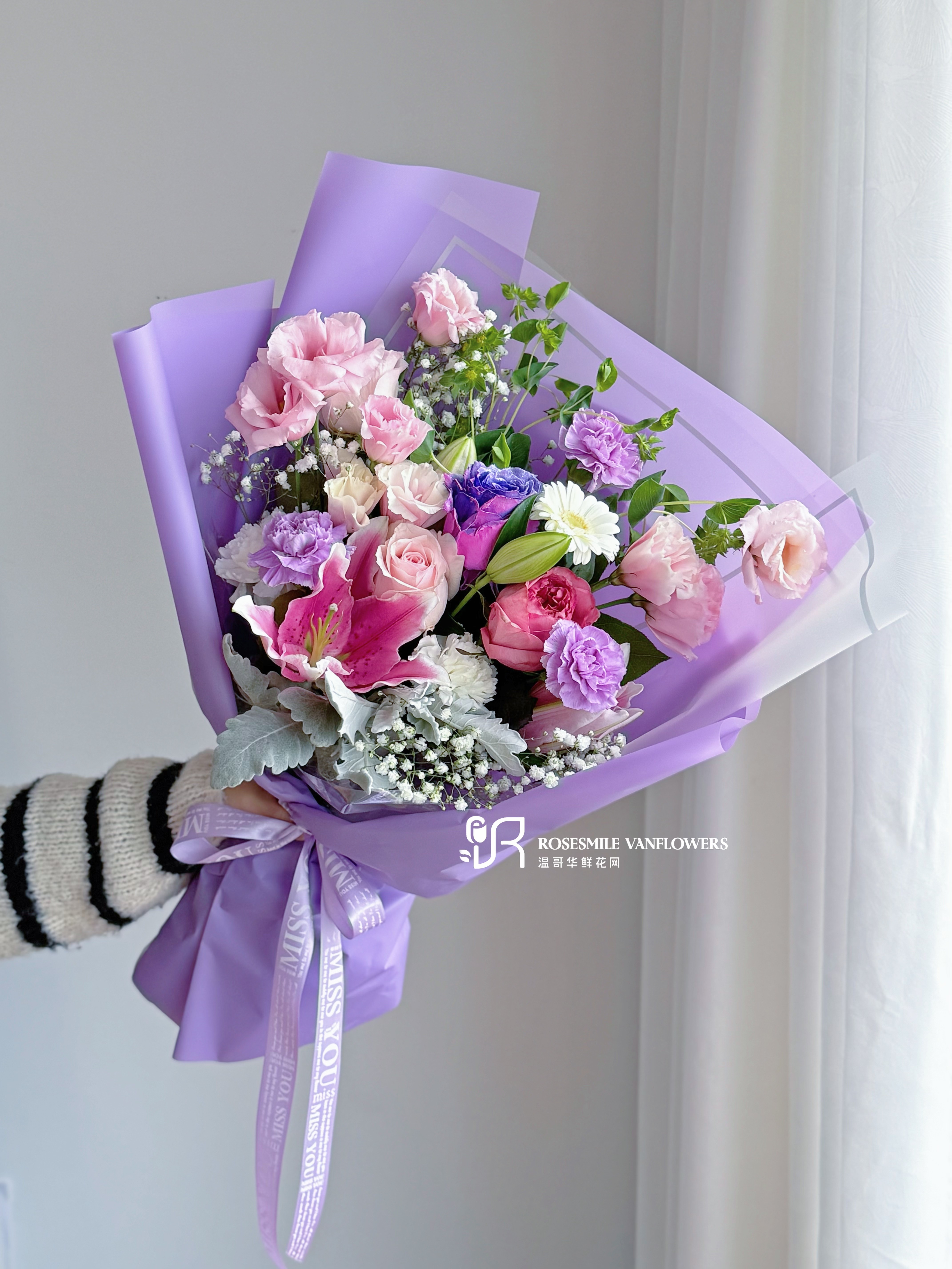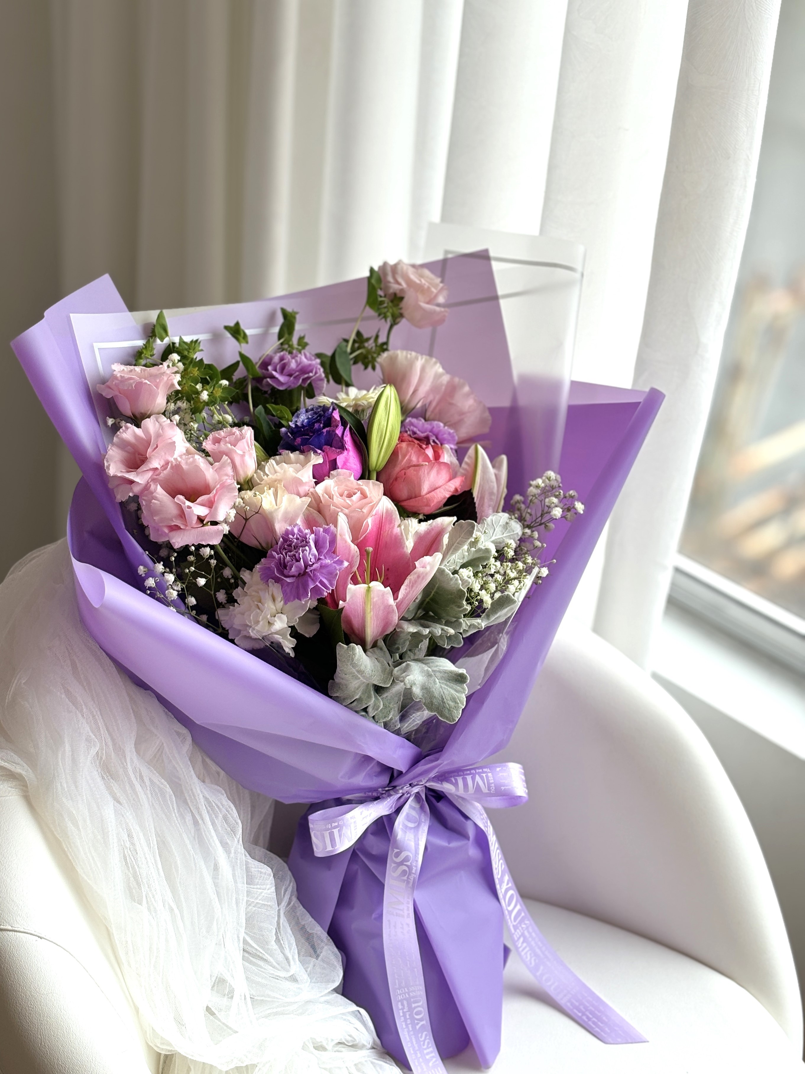 花语花愿:紫韵风华,高雅深邃。百合象征纯洁,玫瑰表达真挚爱意,桔梗寄予祝福,康乃馨温暖守护,银叶菊与满天星点缀出永恒的优雅。愿这份紫色的深情伴随你,带来宁静与美好的时光。