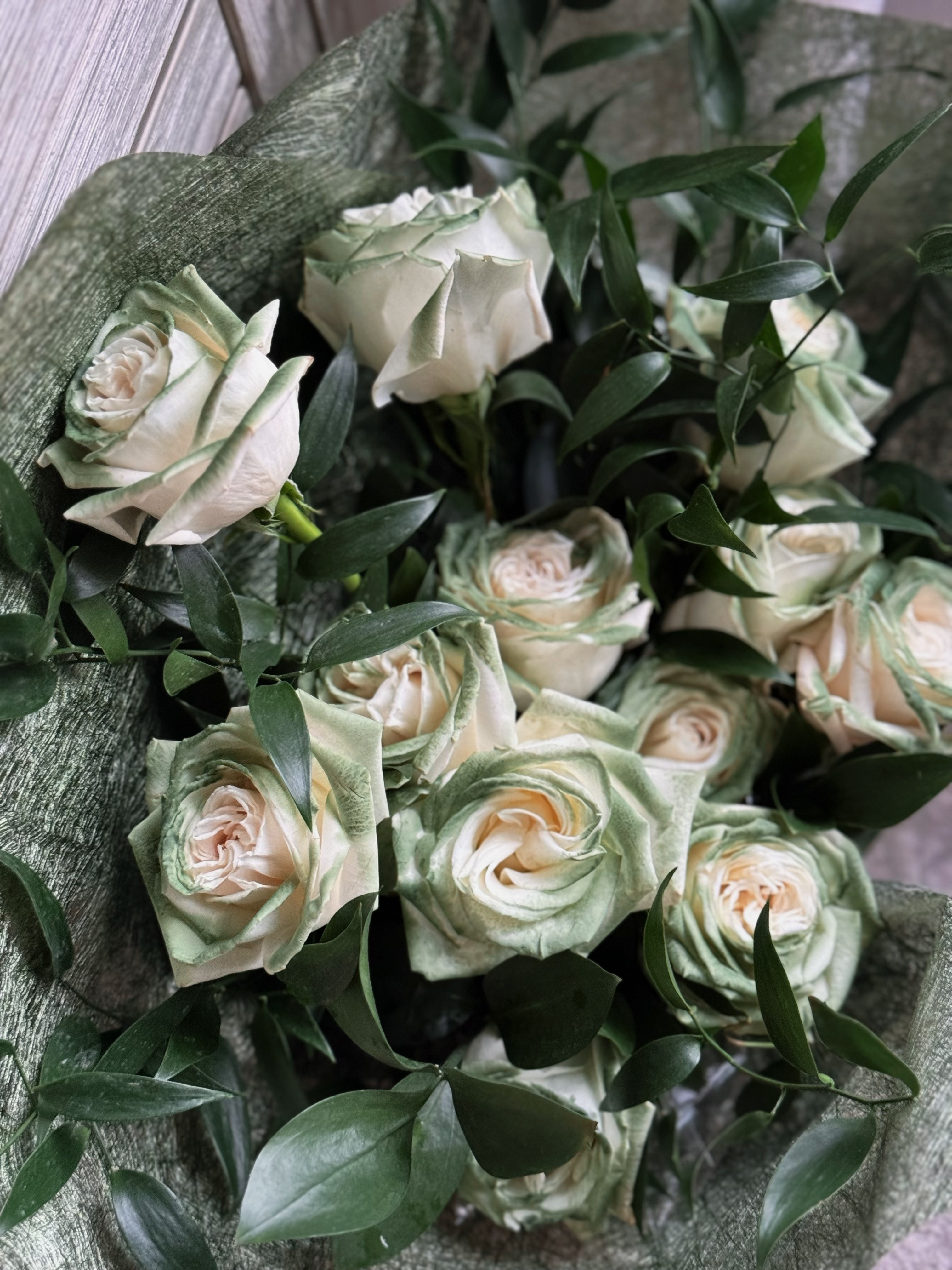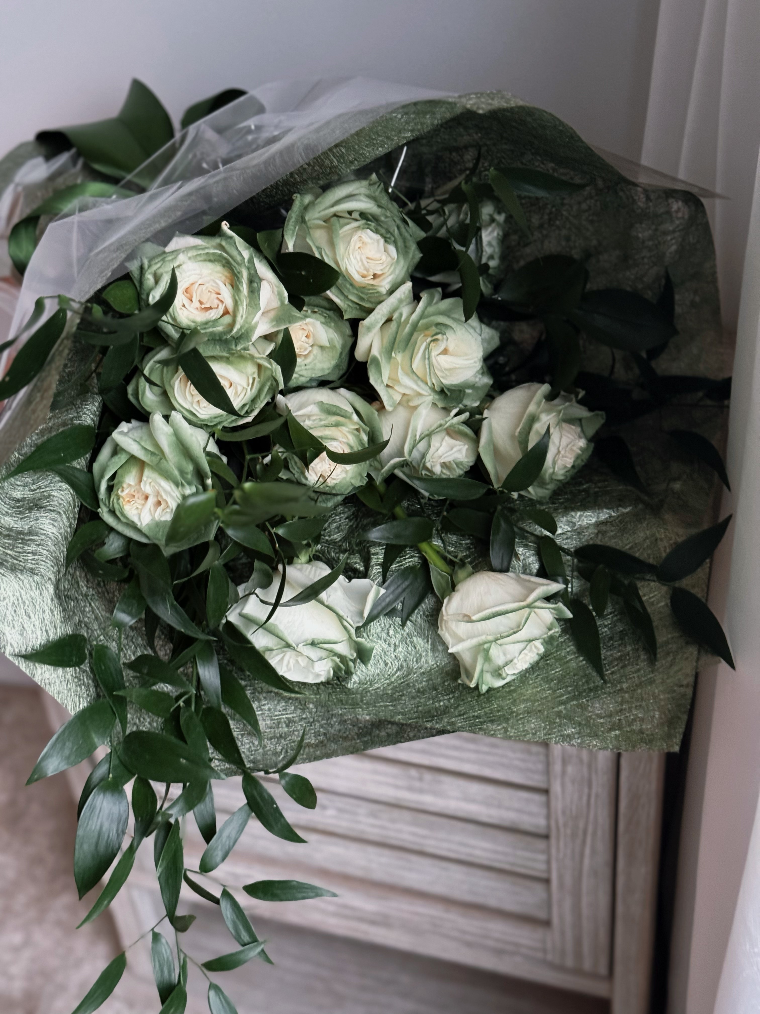 花材:11朵苏格兰绿玫瑰(染色),意大利叶