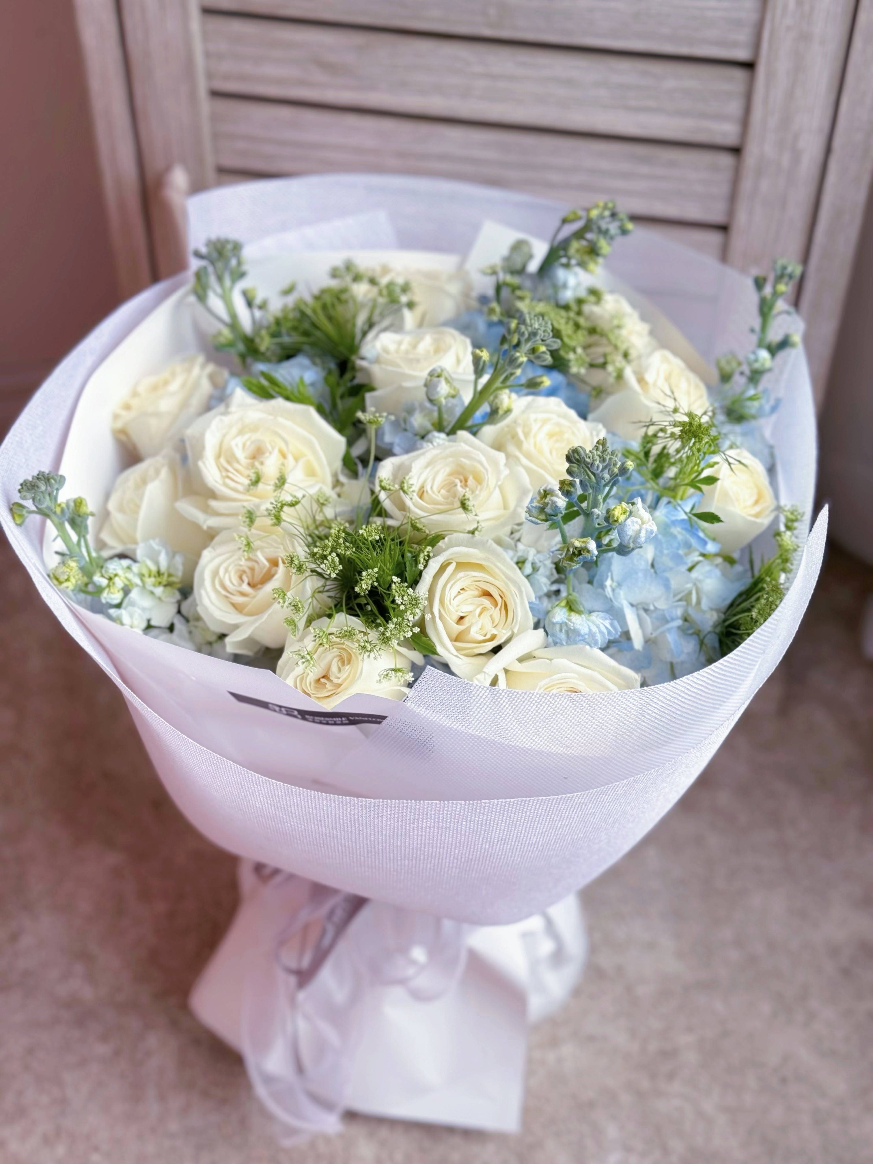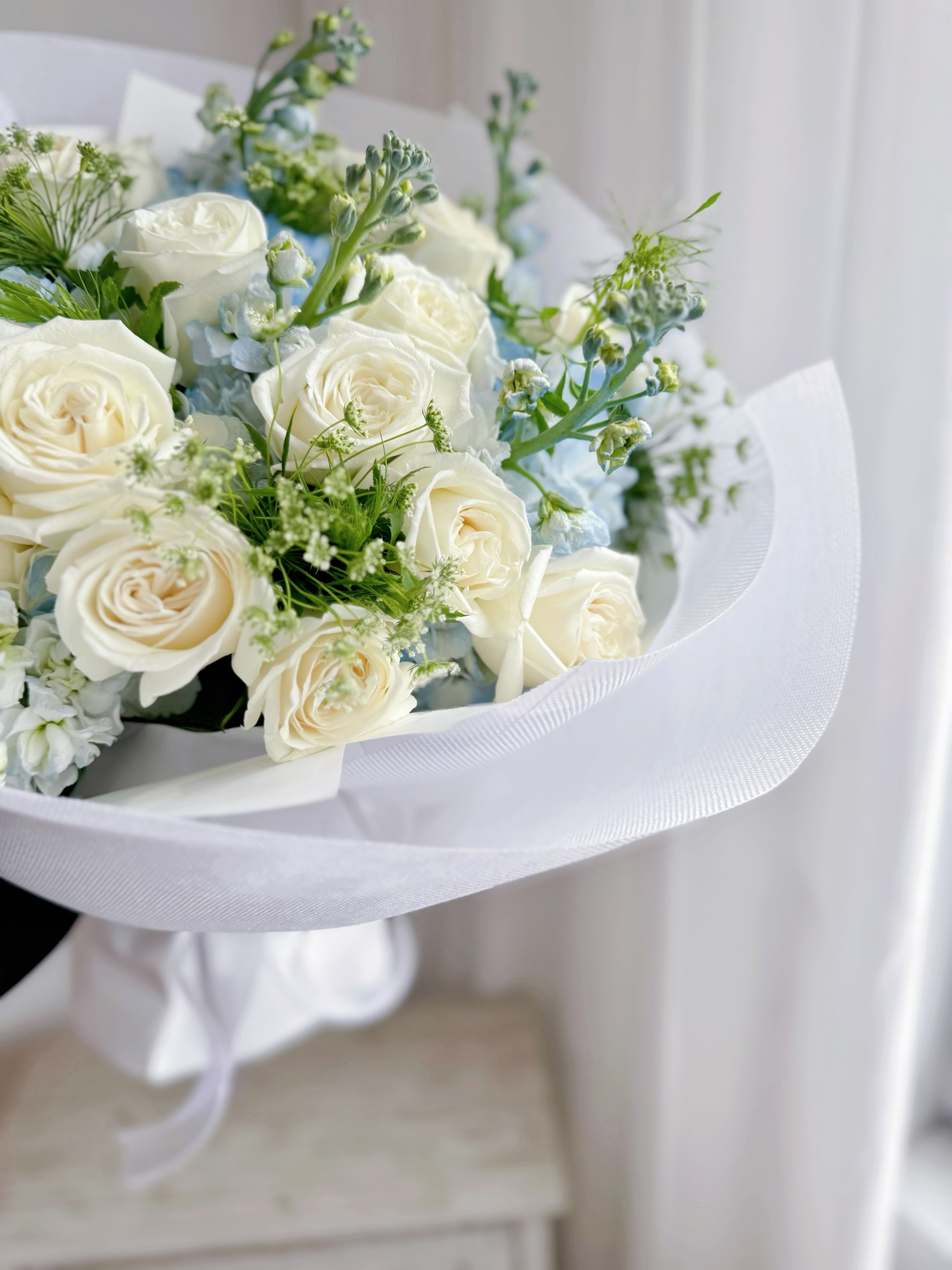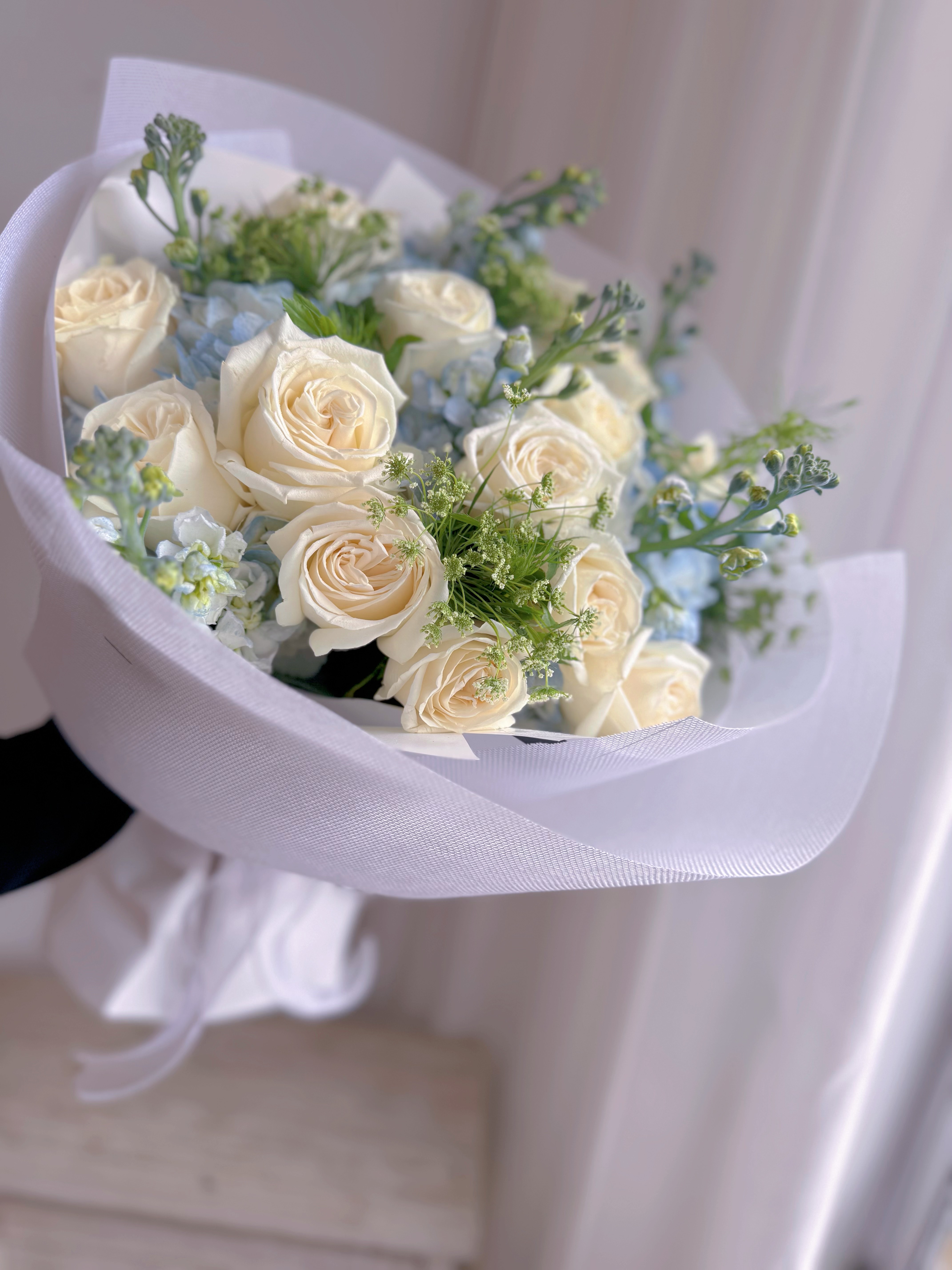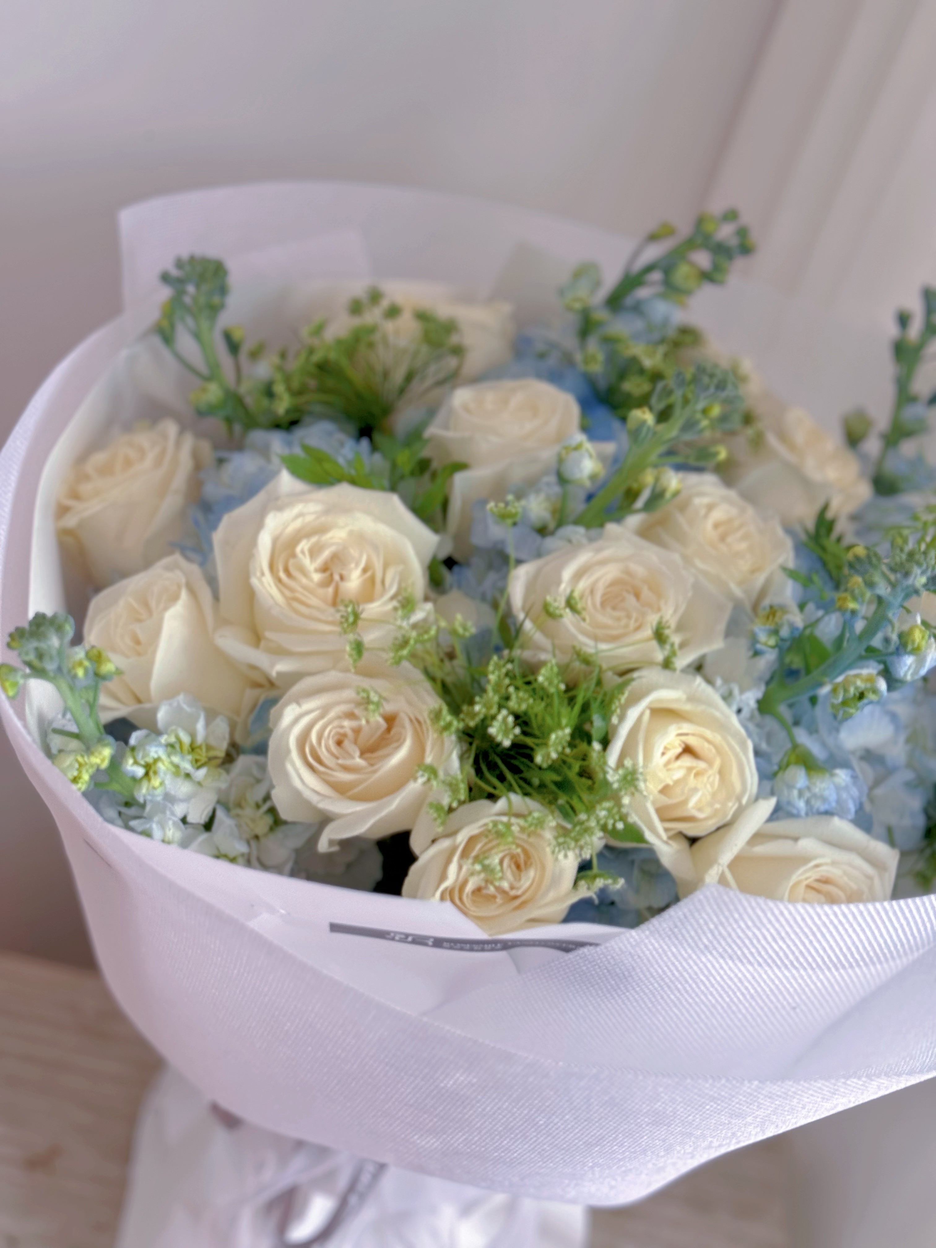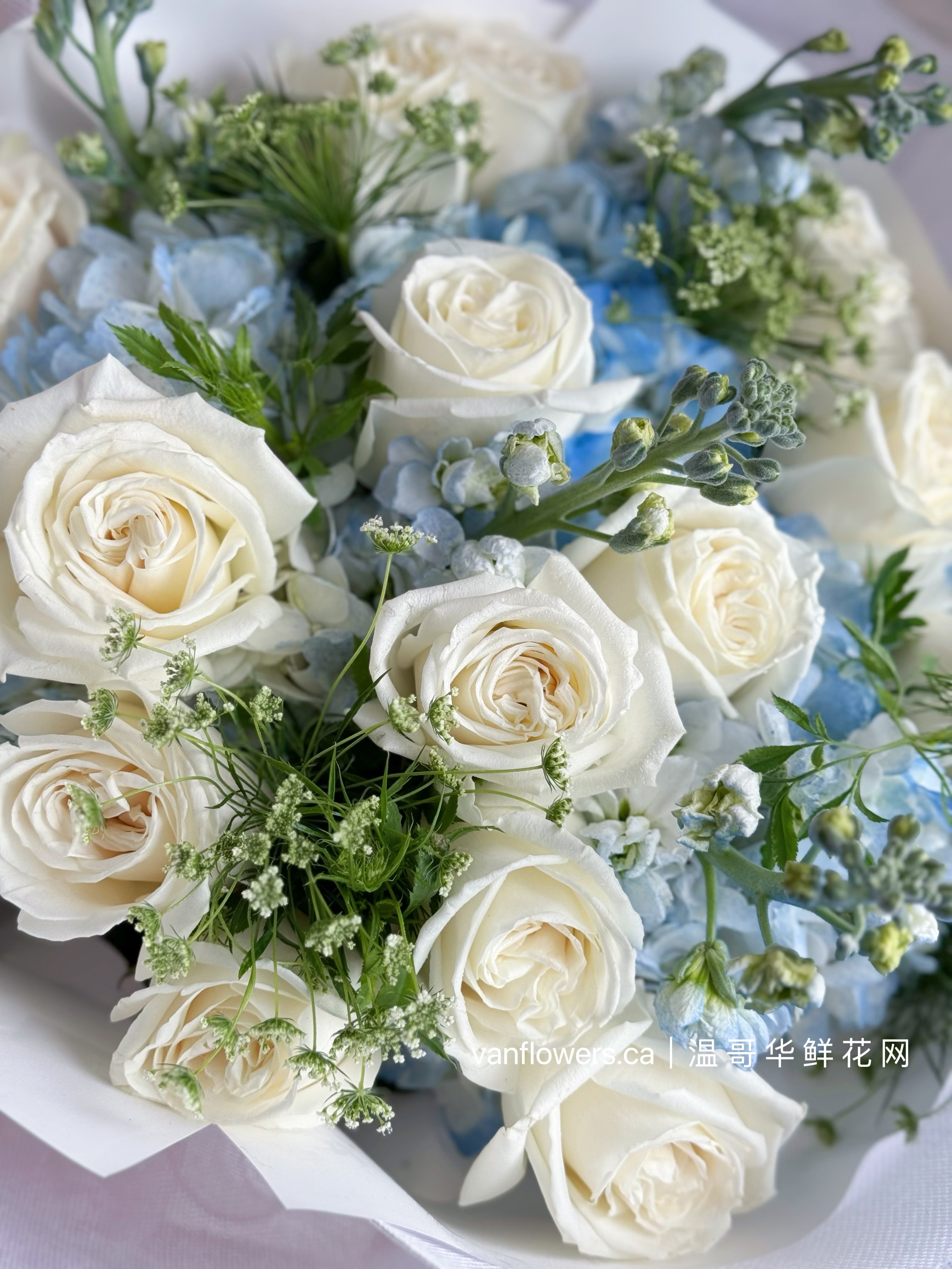 花材:16枝厄瓜多尔白玫瑰,3枝进口蓝色绣球,蓝色飞燕(或染蓝紫罗兰),安妮蕾丝
