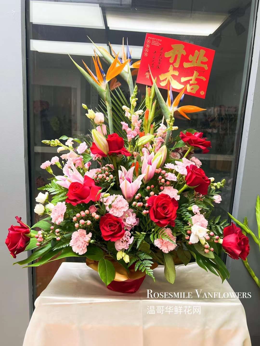 花材:天堂鸟、百合、玫瑰、火龙珠、康乃馨等喜庆花材及配花,丰满绿叶衬托,根据库存实际花材合理搭配。