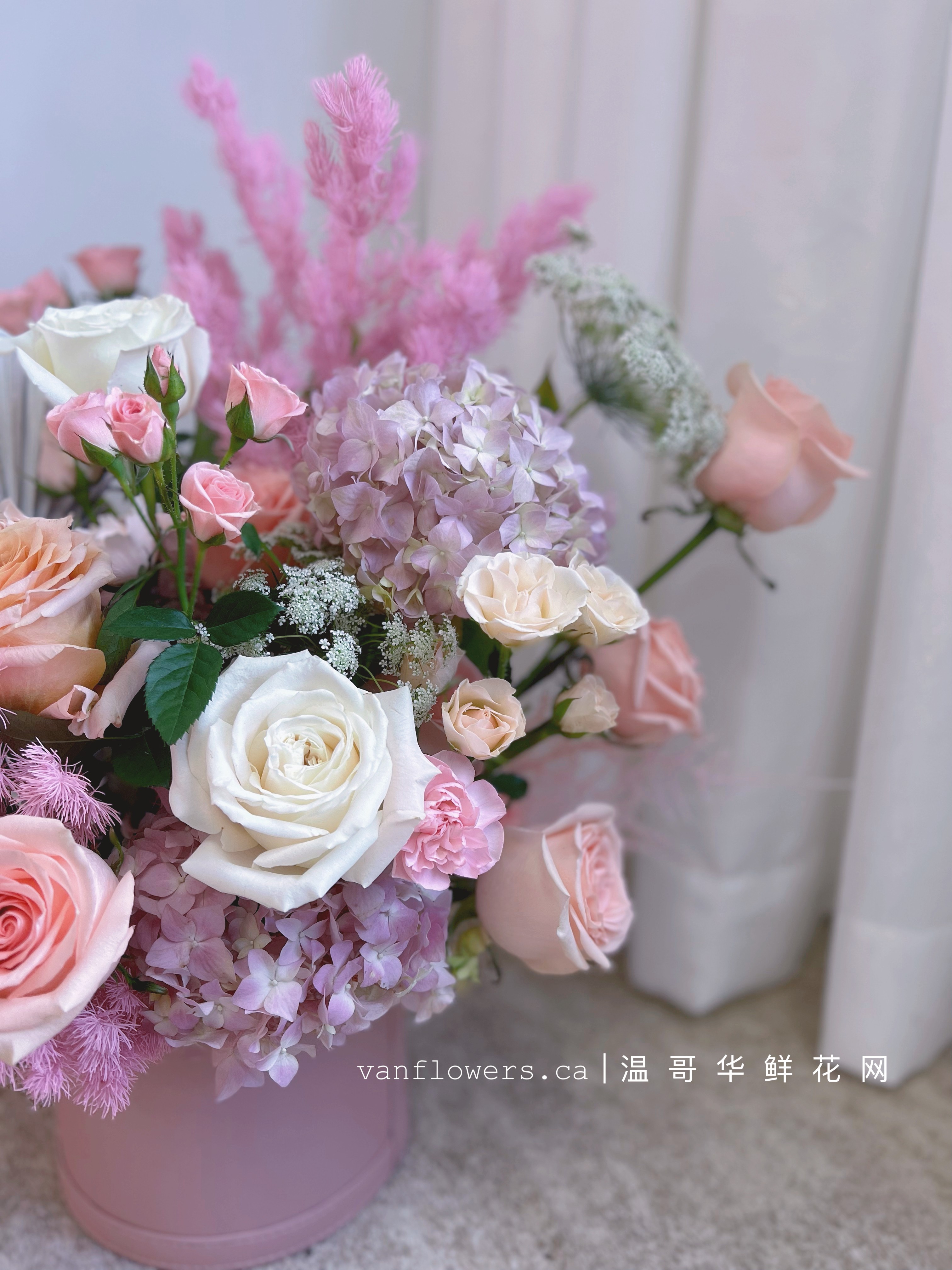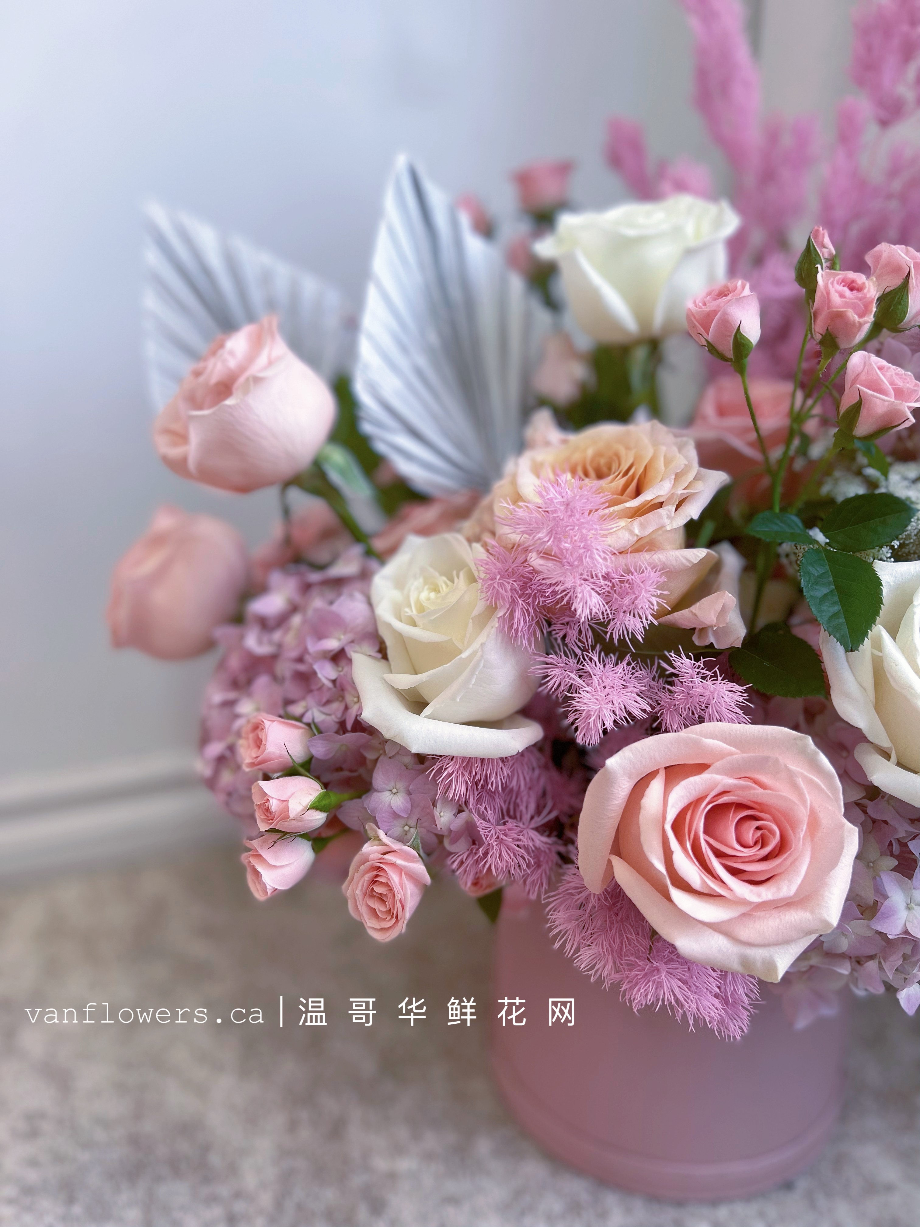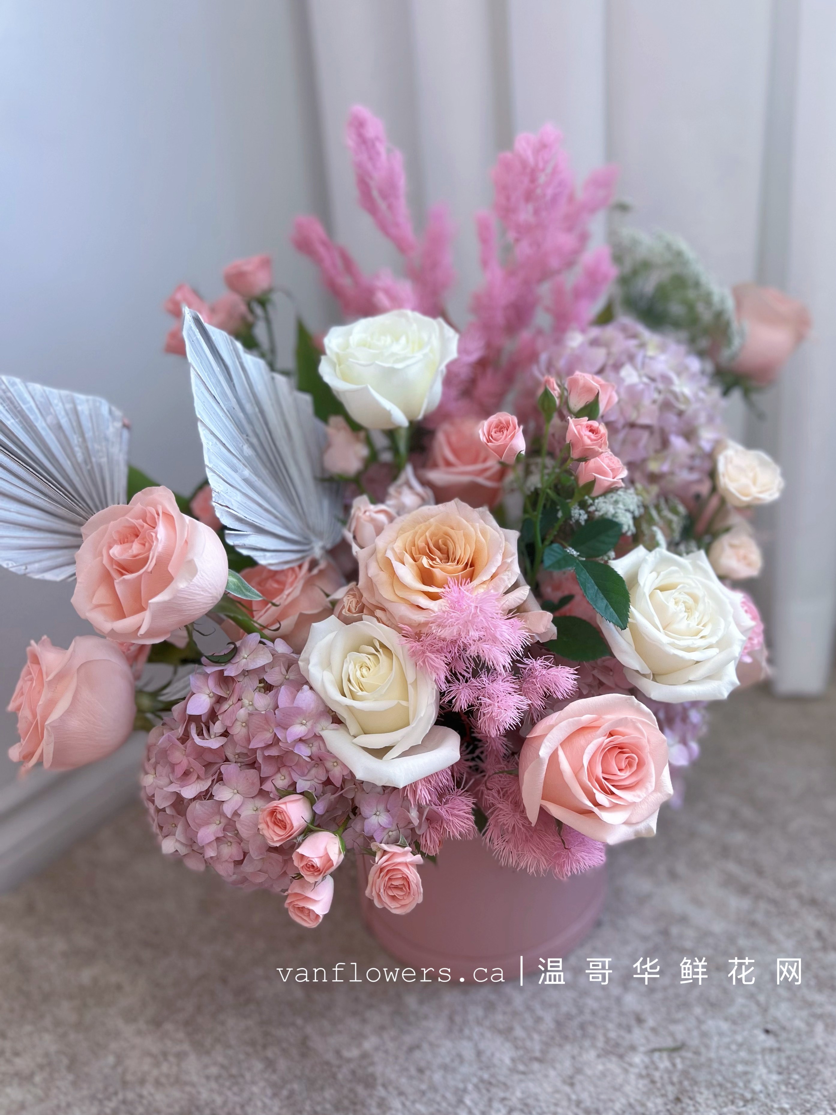 花材:厄瓜多尔白/粉/香槟大玫瑰,粉/香槟小玫瑰,粉色雾松,白色蒲叶,蕾丝,浅粉绣球,粉白大小康乃馨等丰富花材