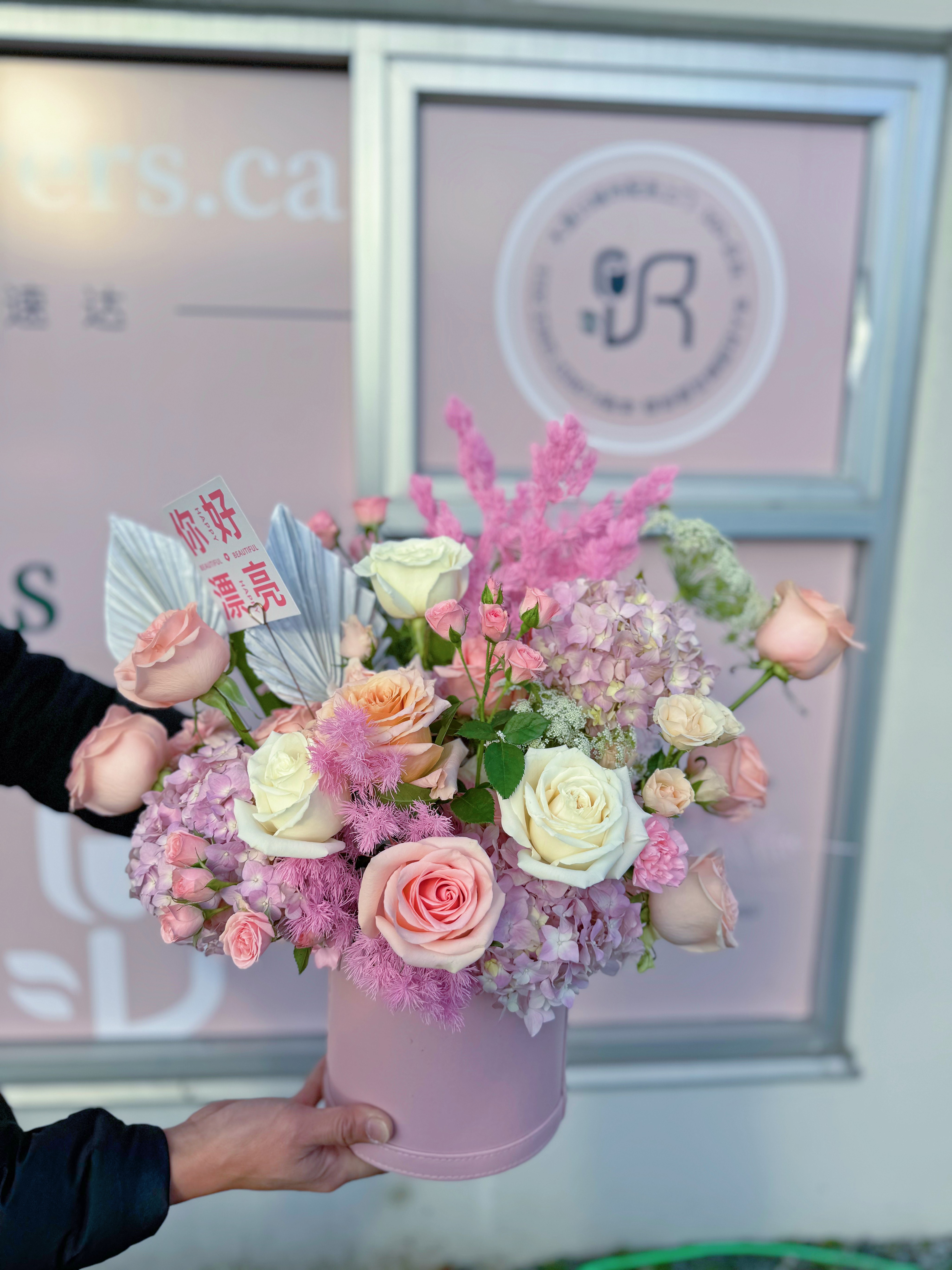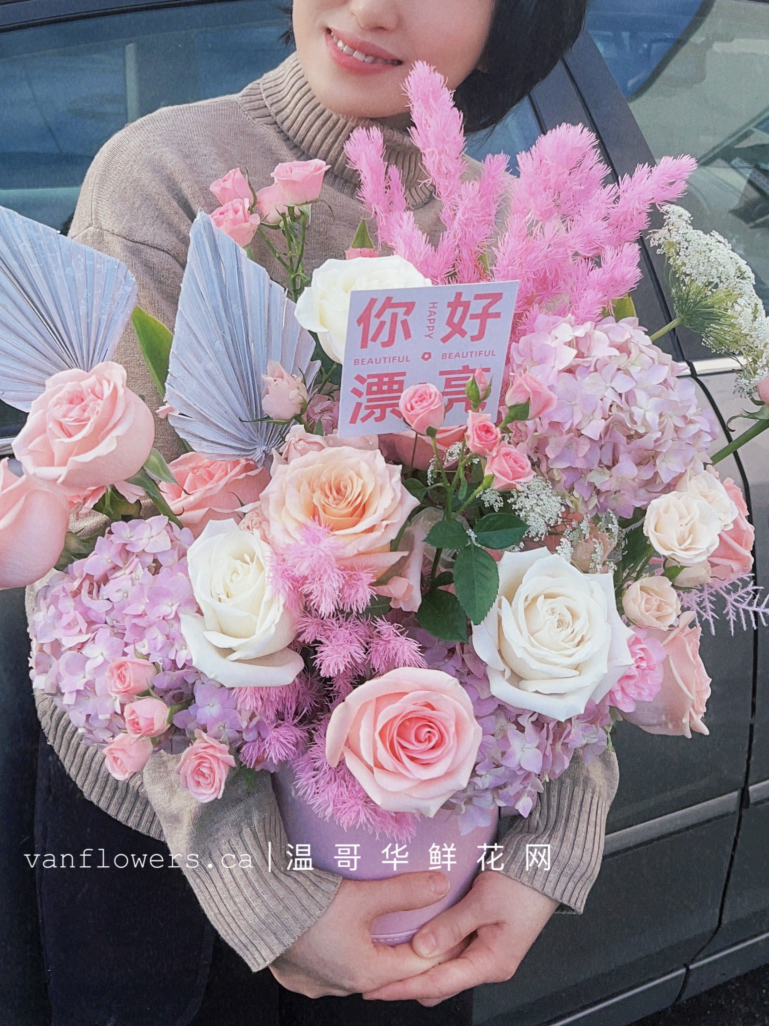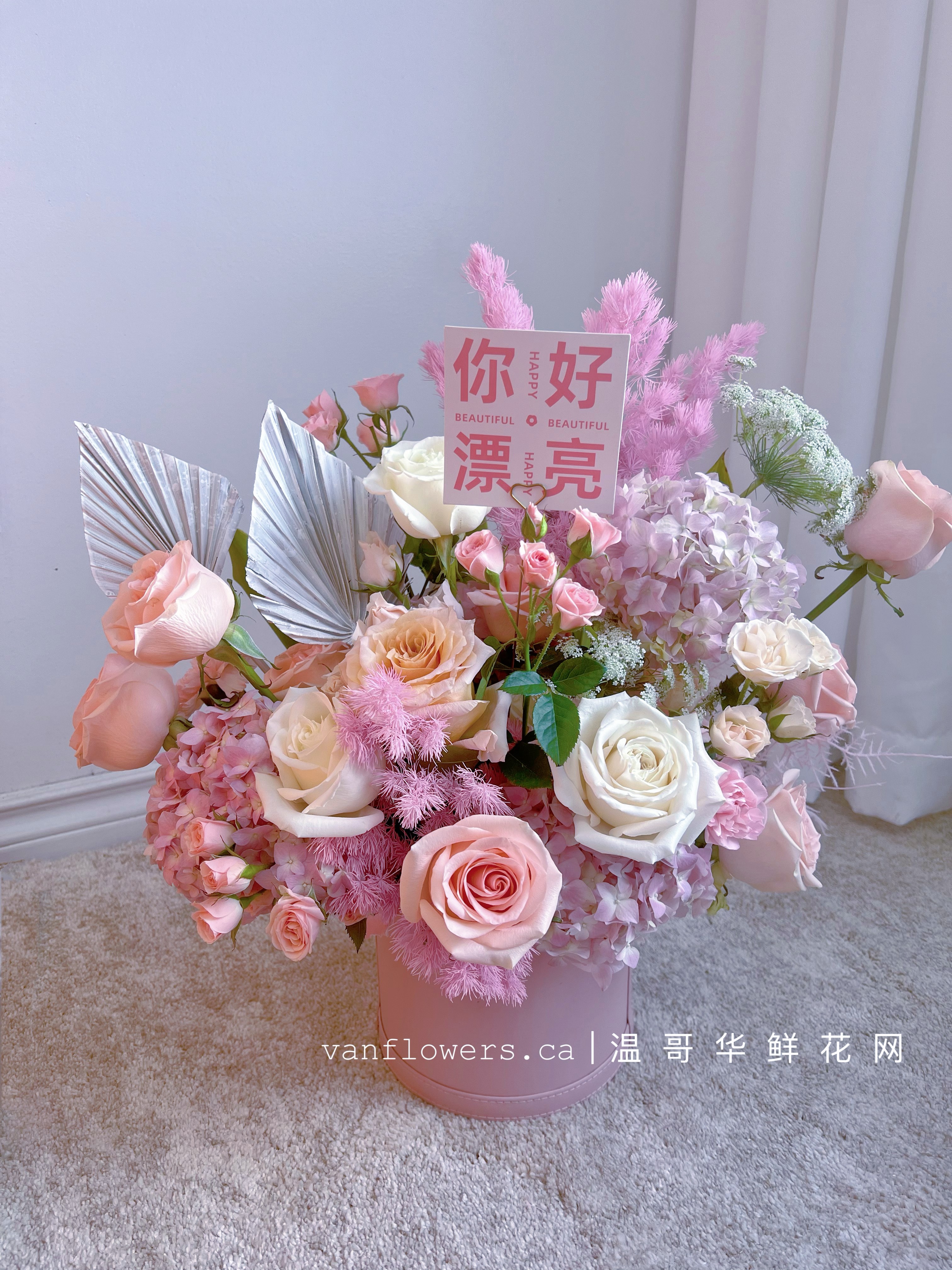花材:厄瓜多尔白/粉/香槟大玫瑰,粉/香槟小玫瑰,粉色雾松,白色蒲叶,蕾丝,浅粉绣球,粉白大小康乃馨等丰富花材