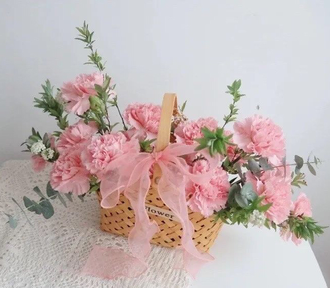 花材:12枝粉色康乃馨,满天星、绿叶等