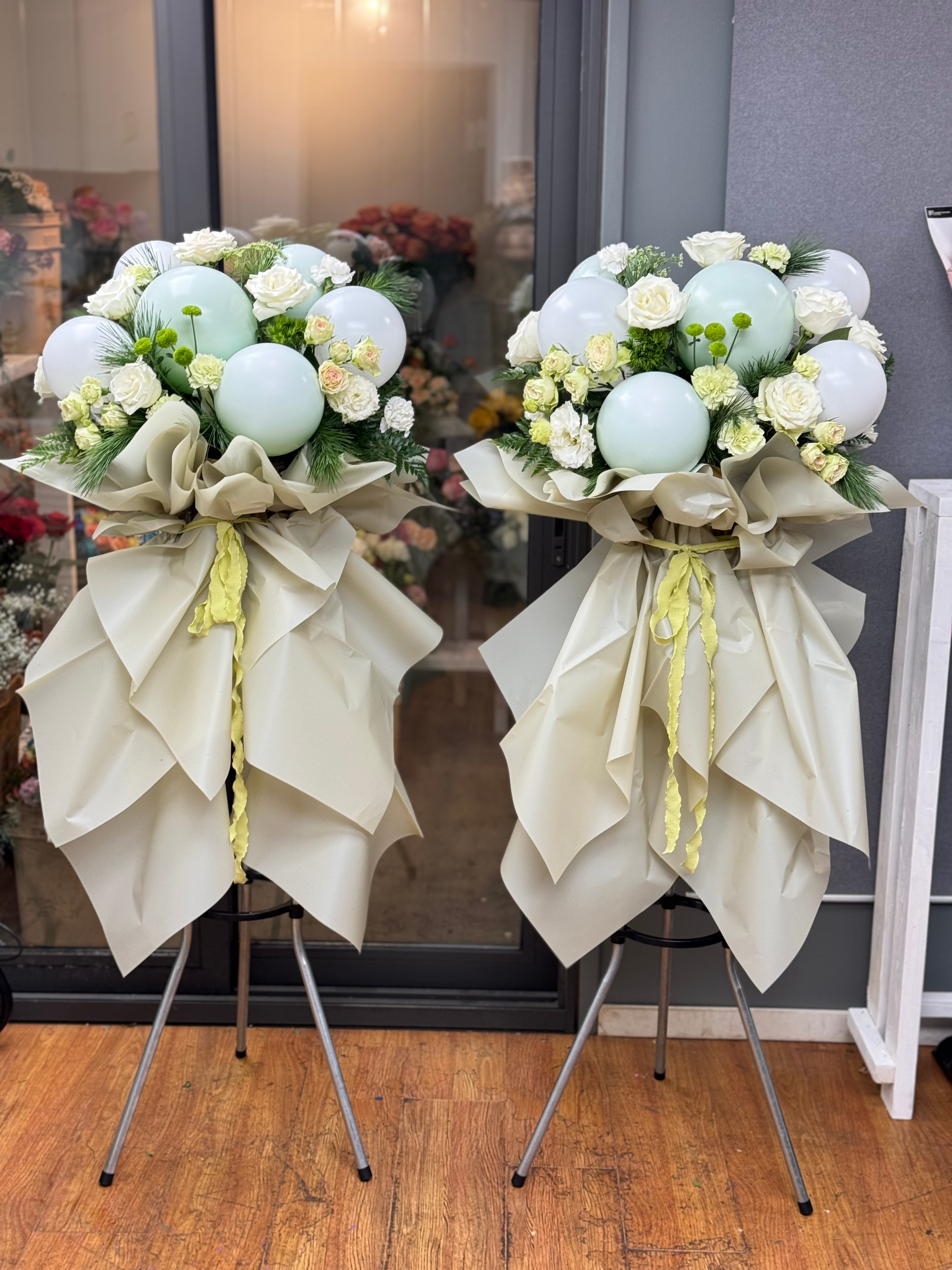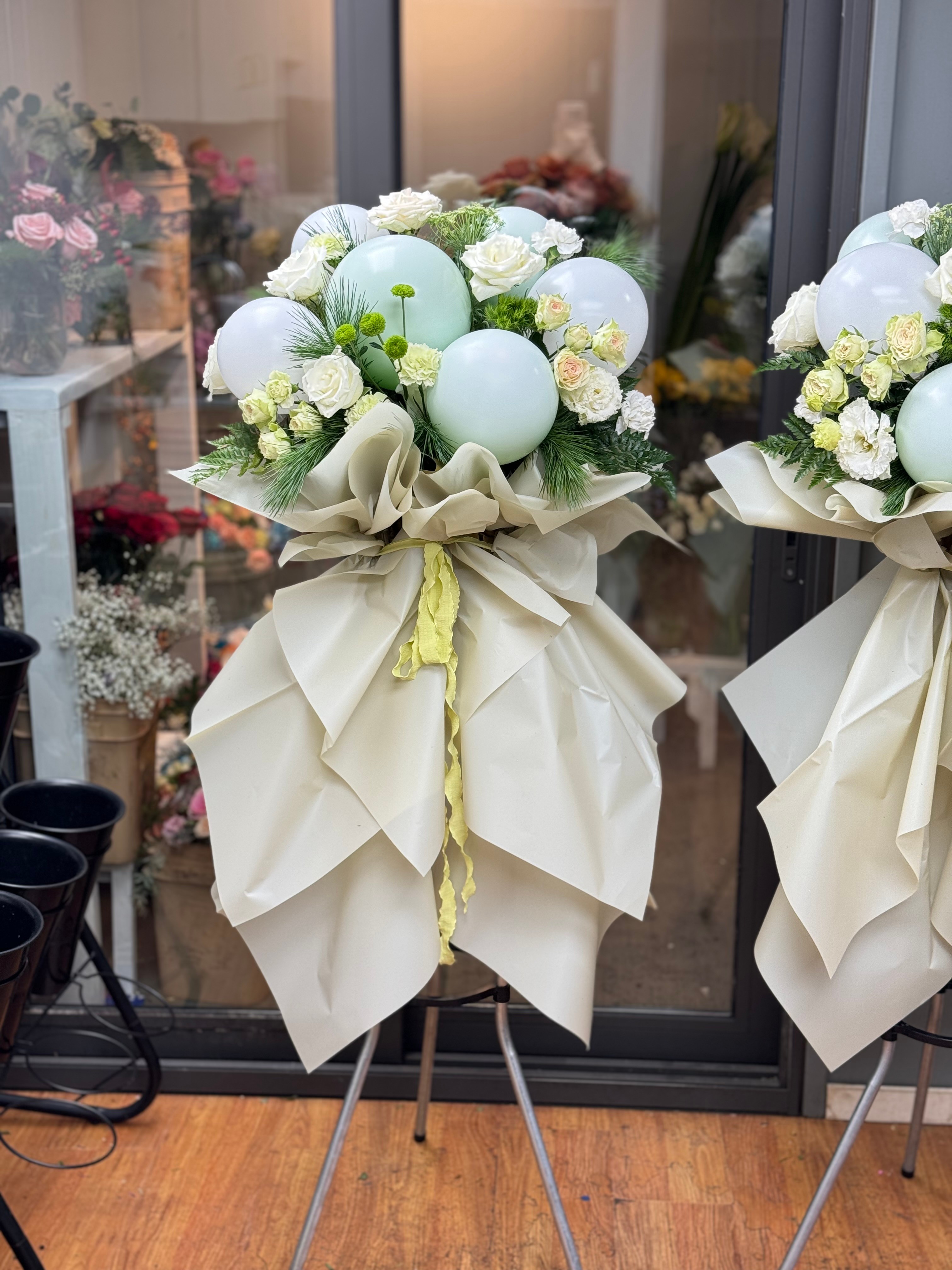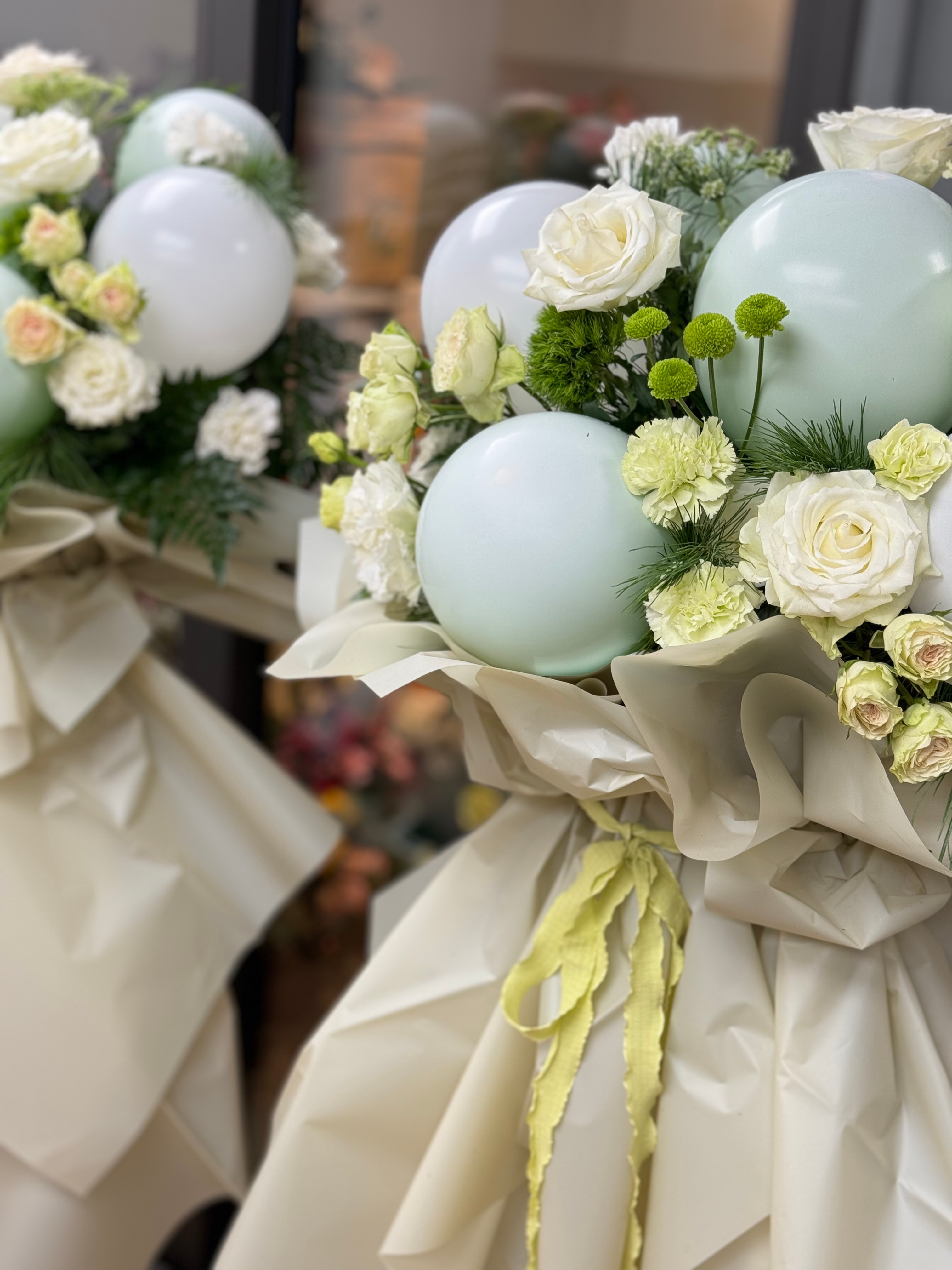花材:气球、丰富鲜花混搭,叶材点缀,根据库存鲜花合理搭配。