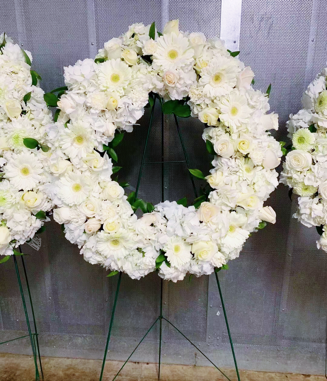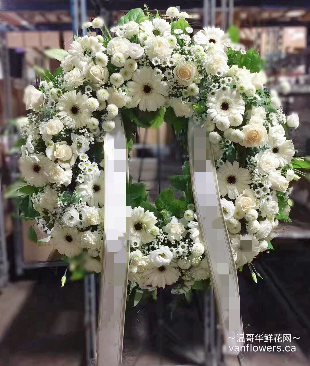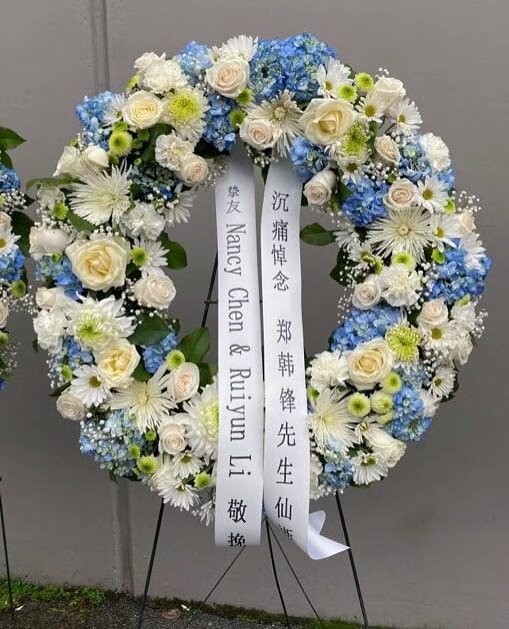 (葬礼用花圈的造型一般有花牌、花环、十字、心形等,此款为热卖花环示例,了解更多颜色、造型、价格,或需特别定制,请微信联络客服以获取图片及报价)