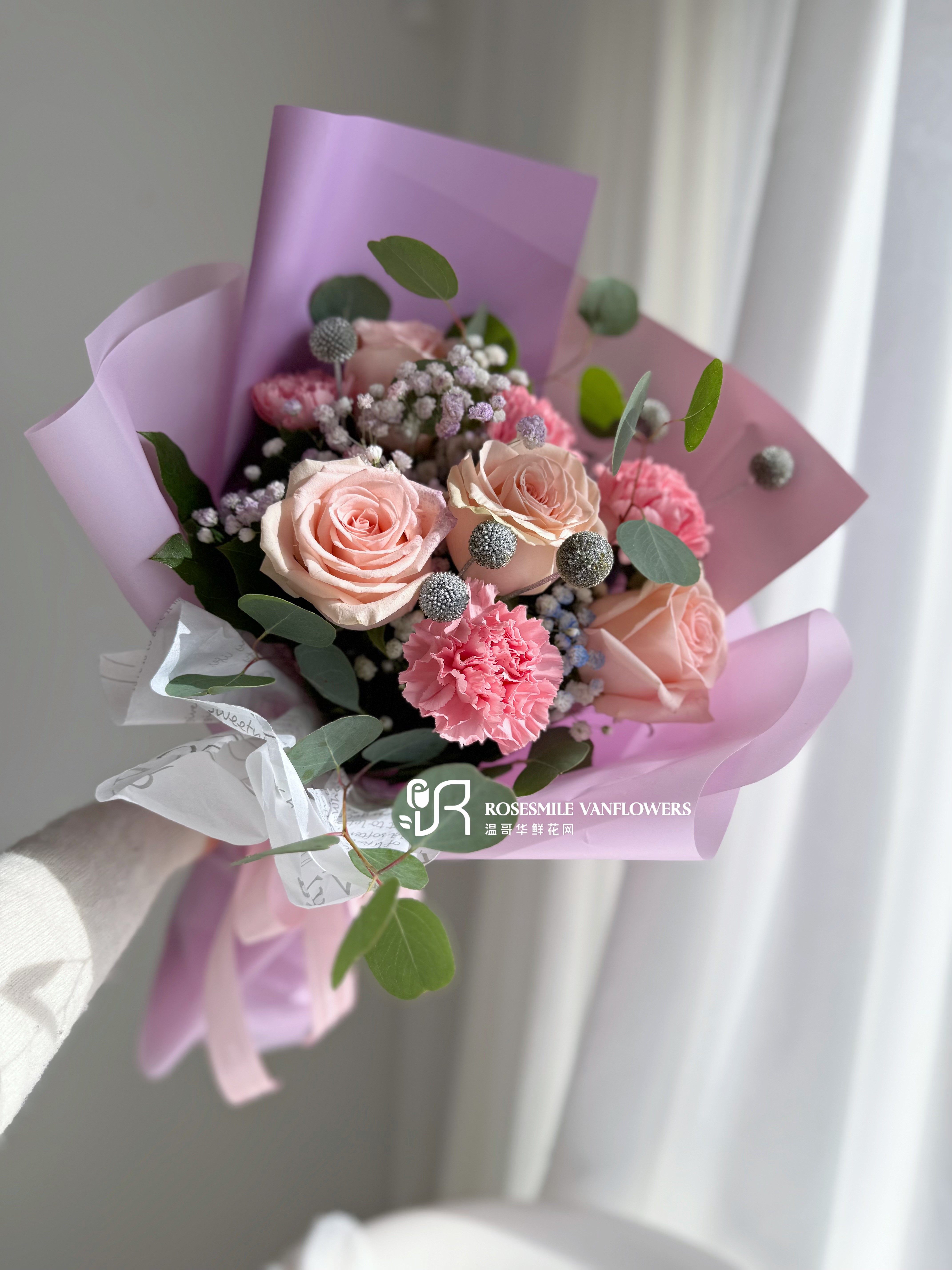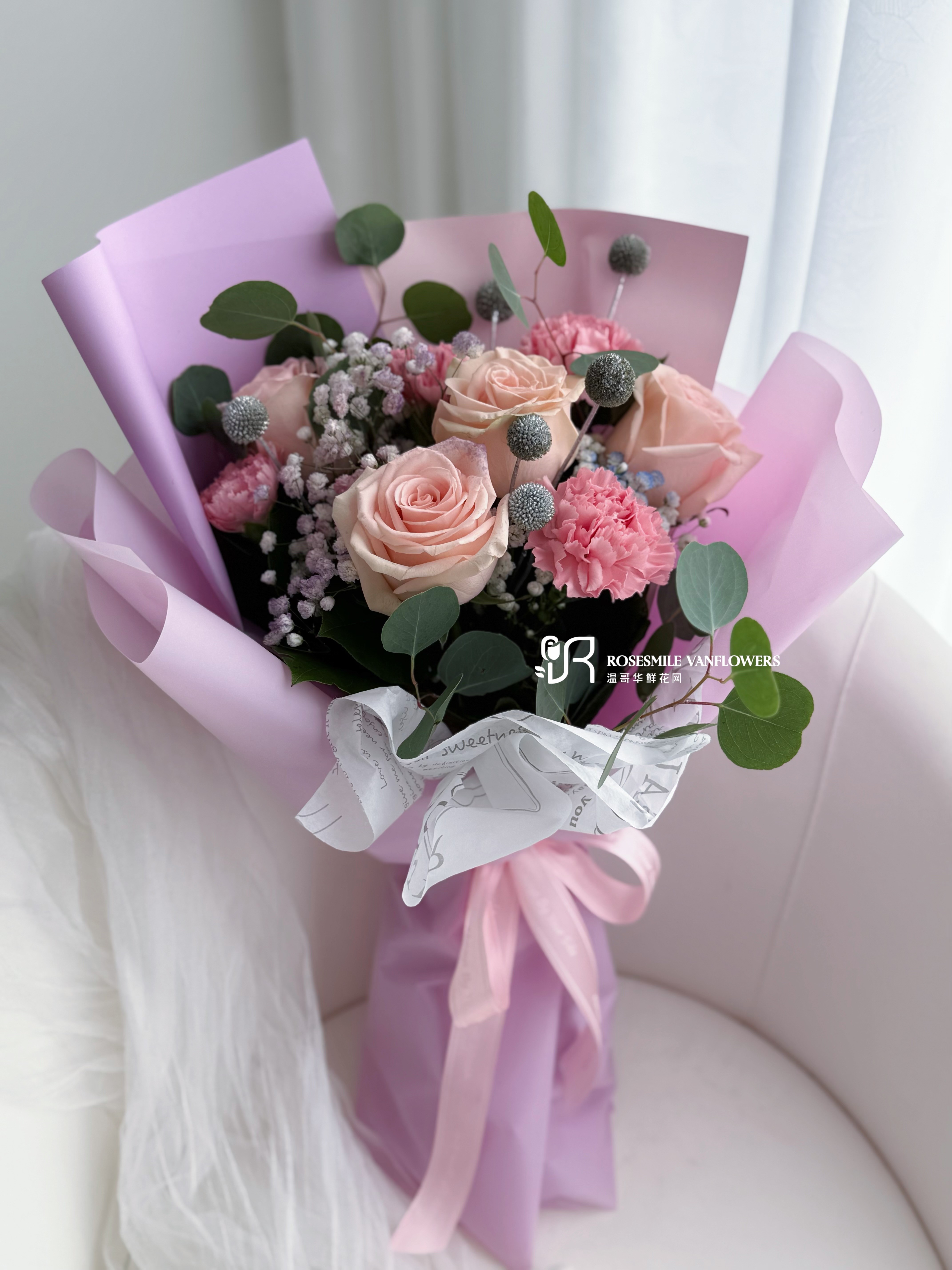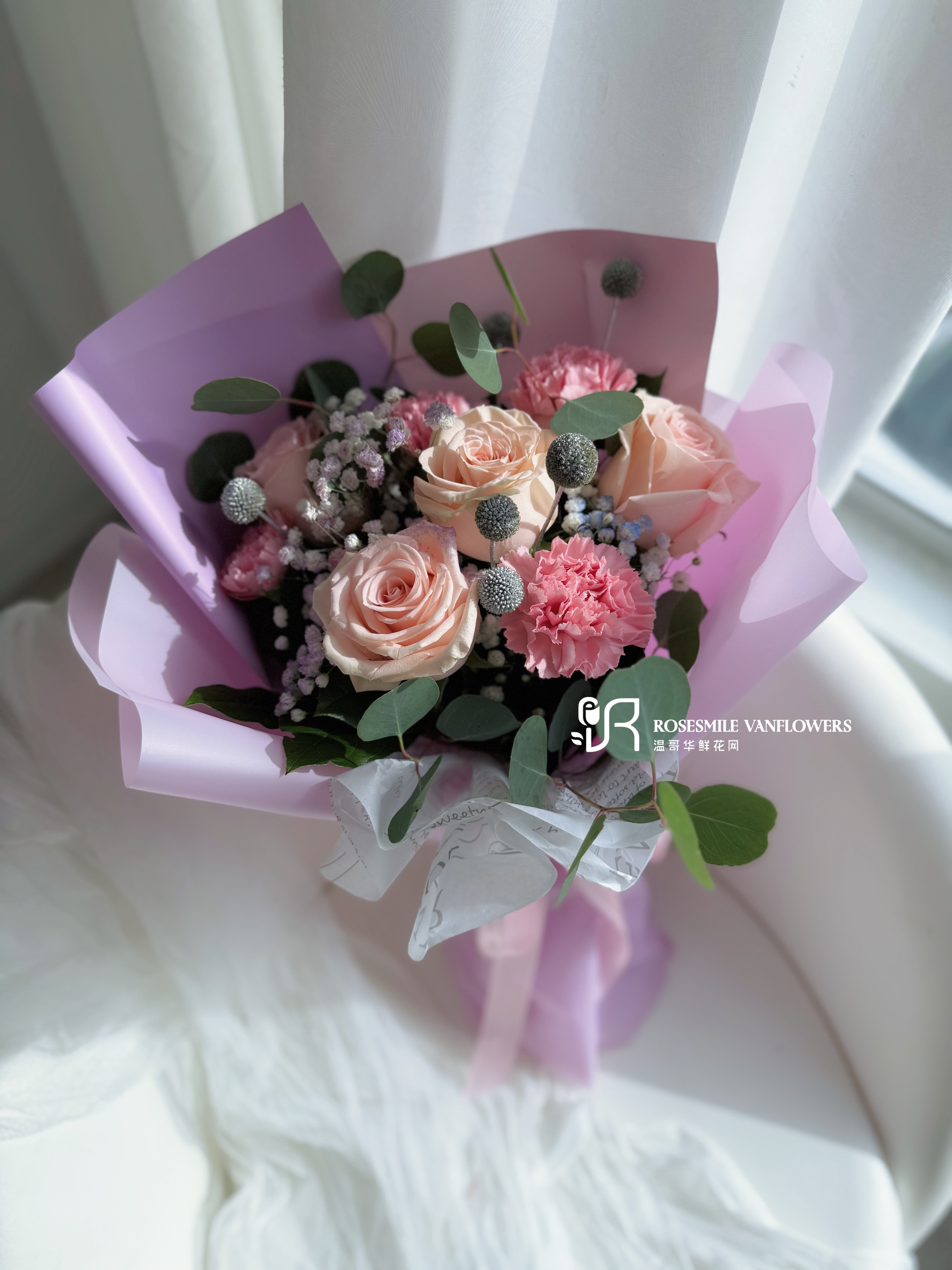 花材:3枝粉玫瑰,4枝粉色康乃馨,1枝蓝刺果,满天星,圆叶尤加利