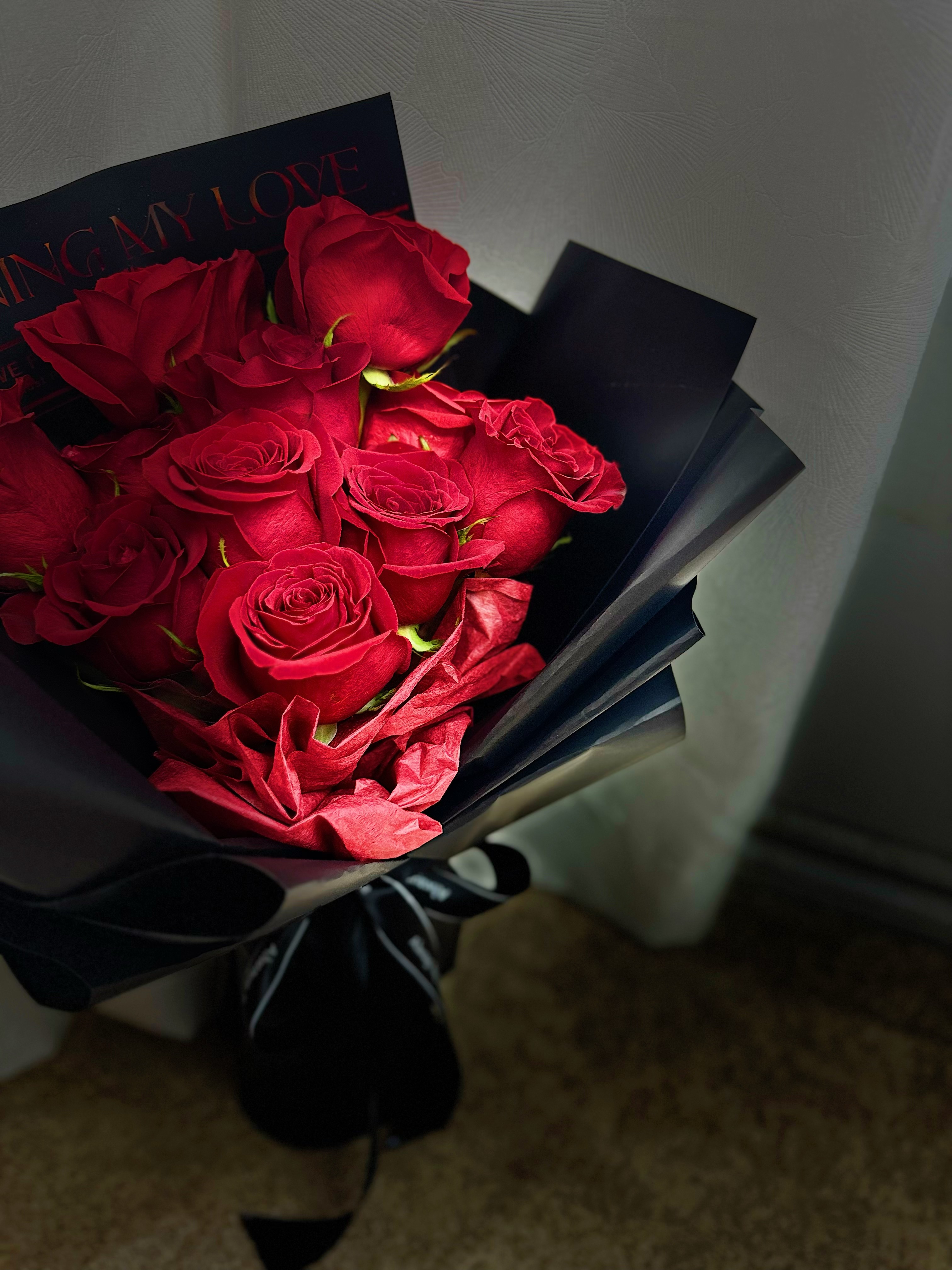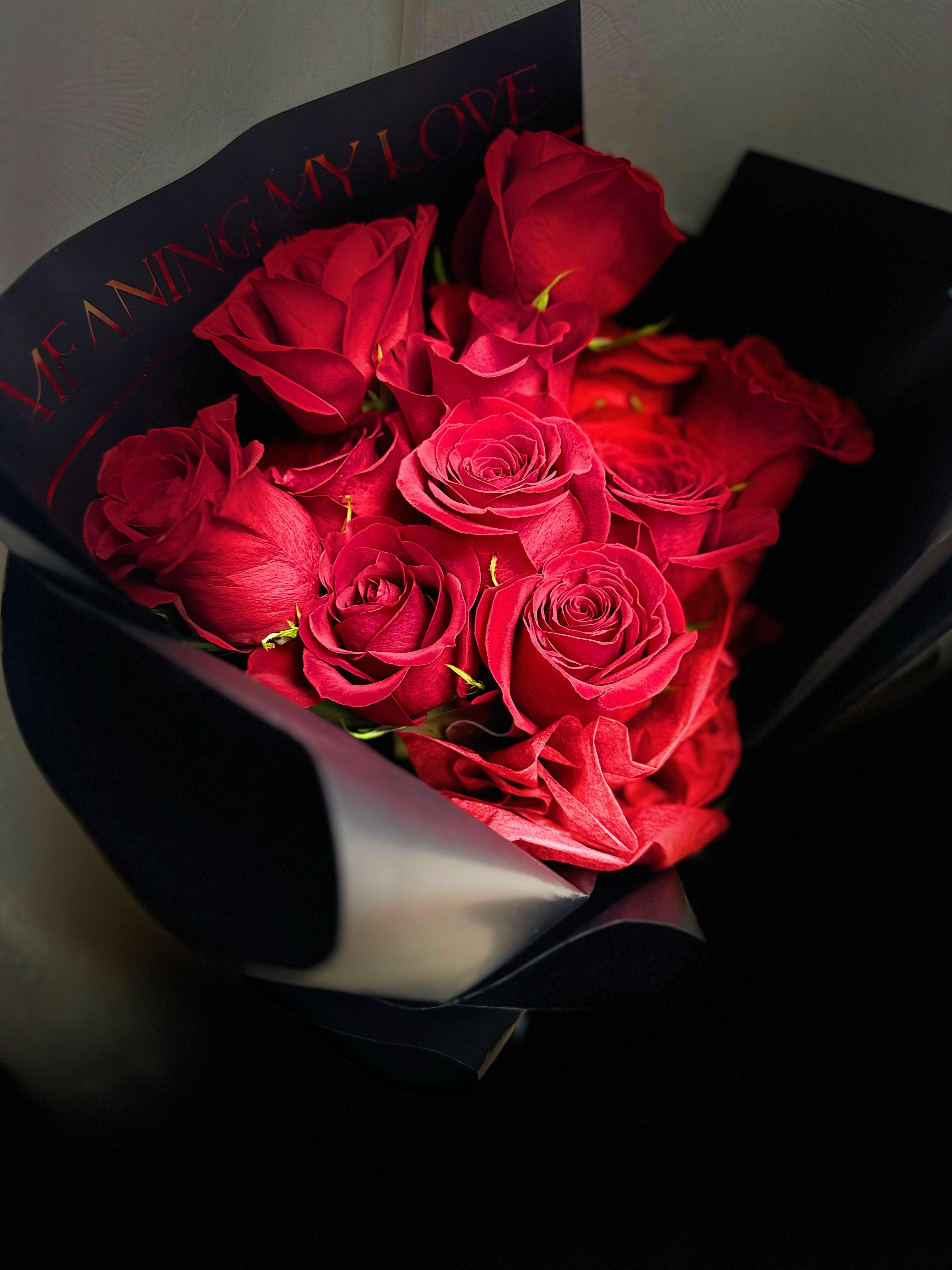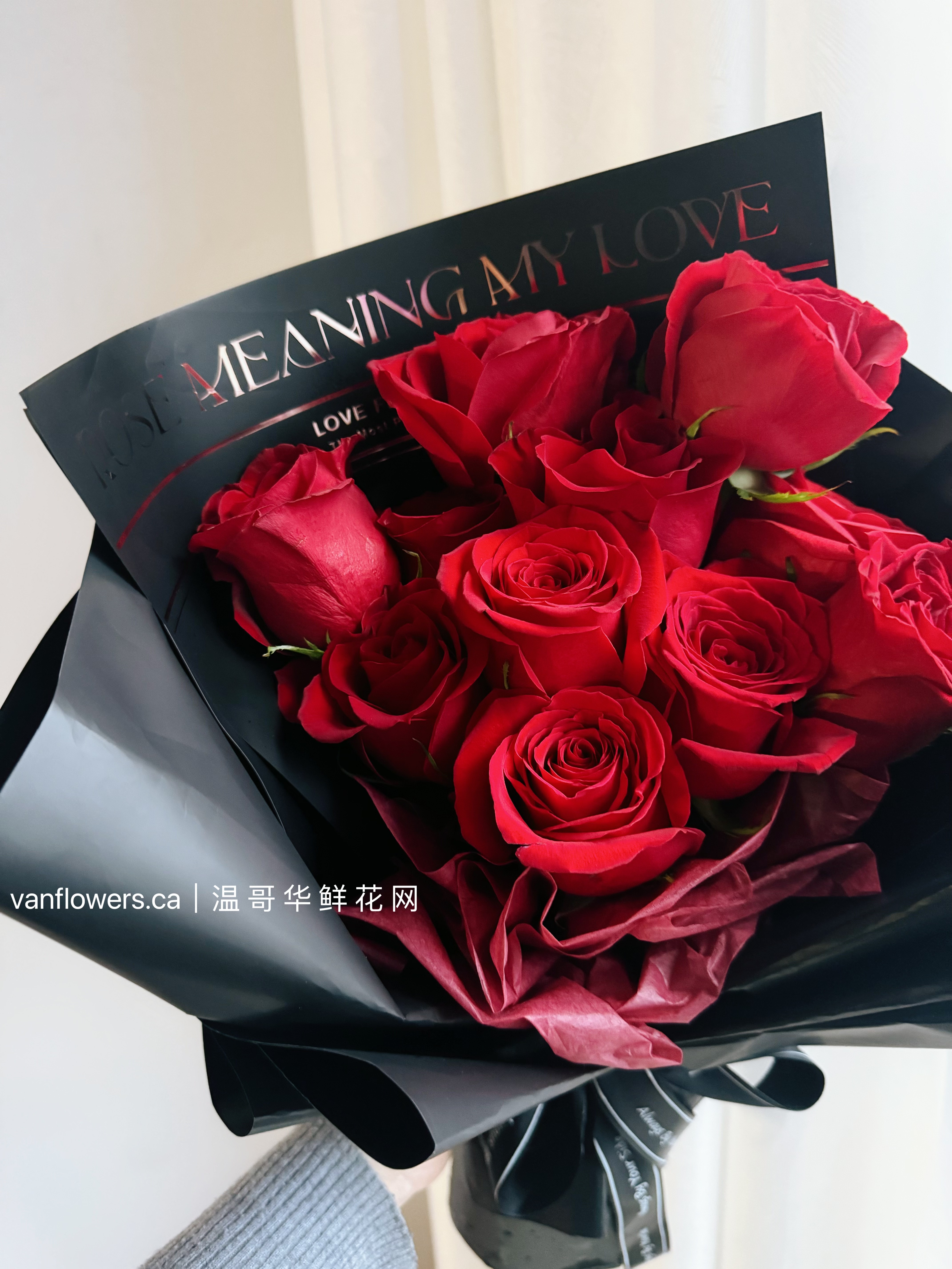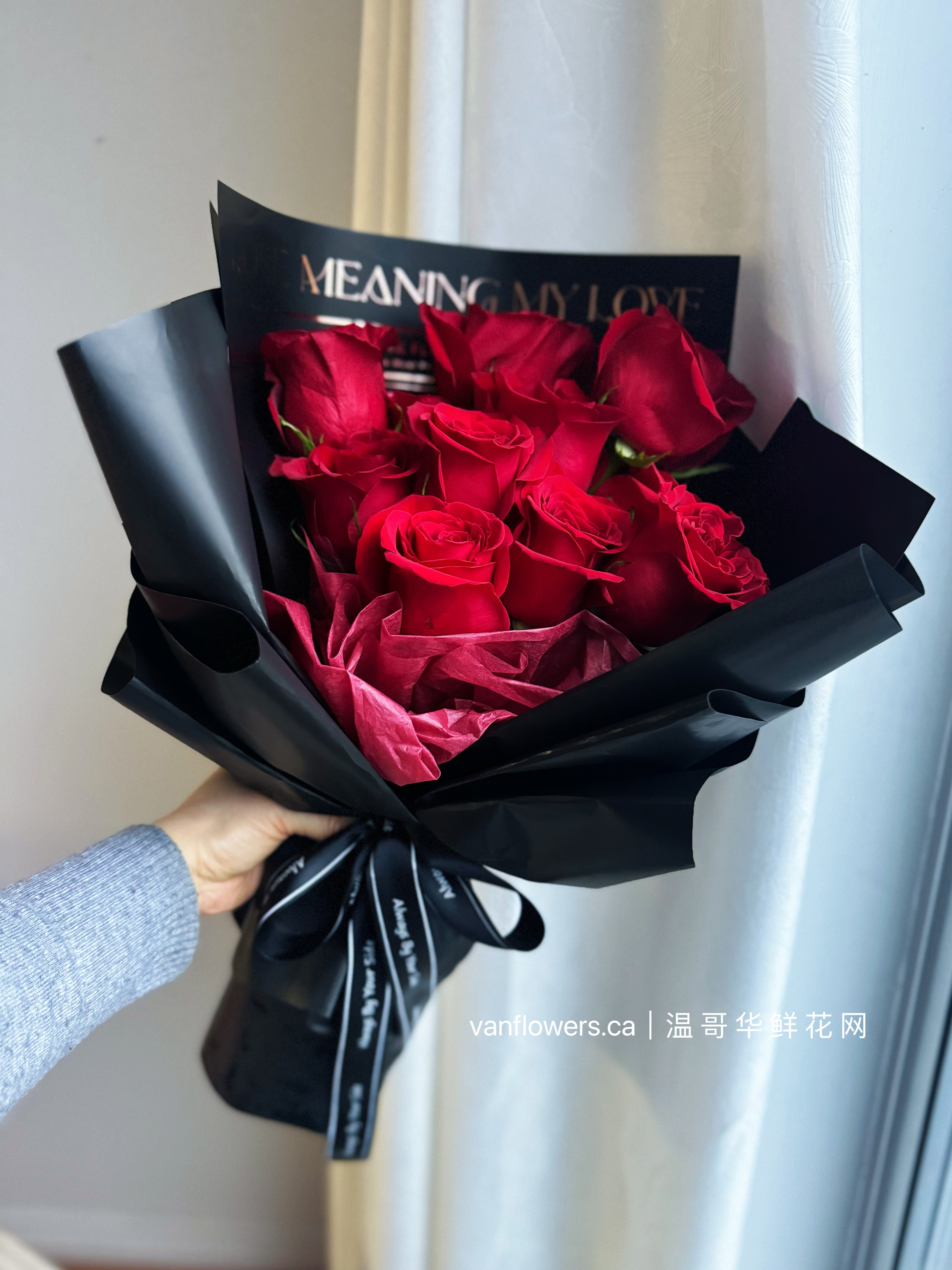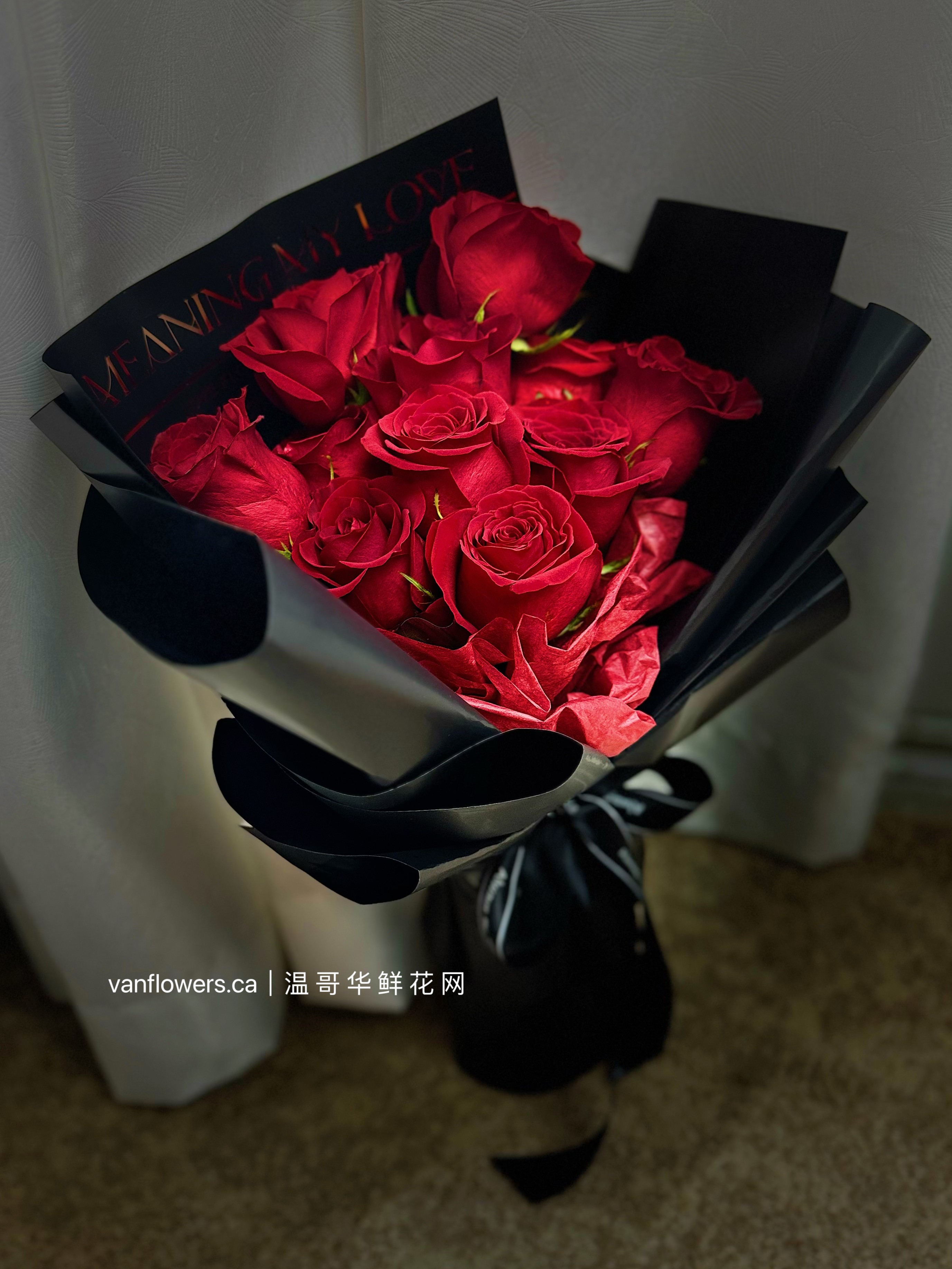 包装:单面花束,金字love英文黑色背景纸,深红牛奶棉纸前衬,黑磨砂多重精美外包装,黑色英文缎带。
