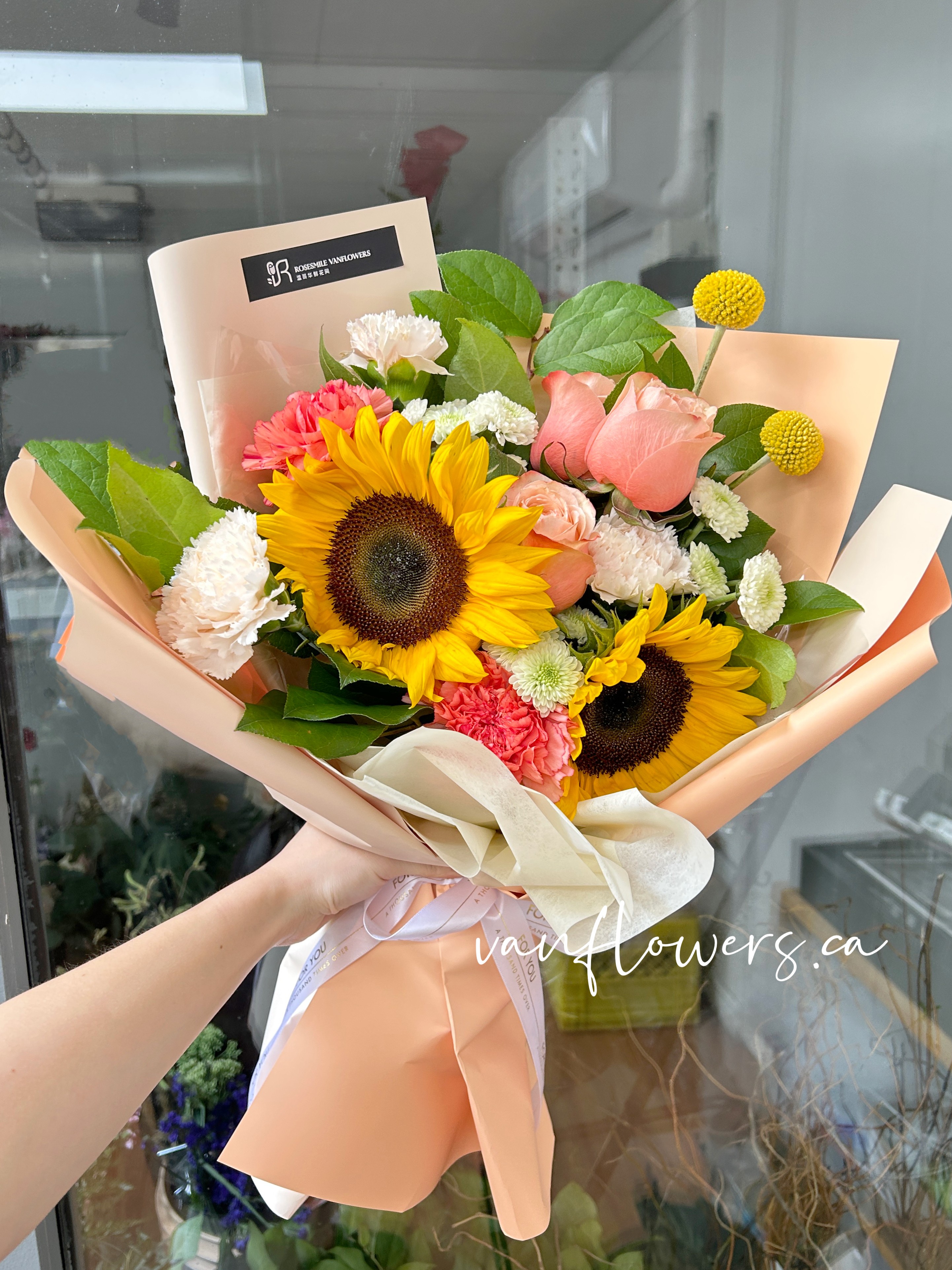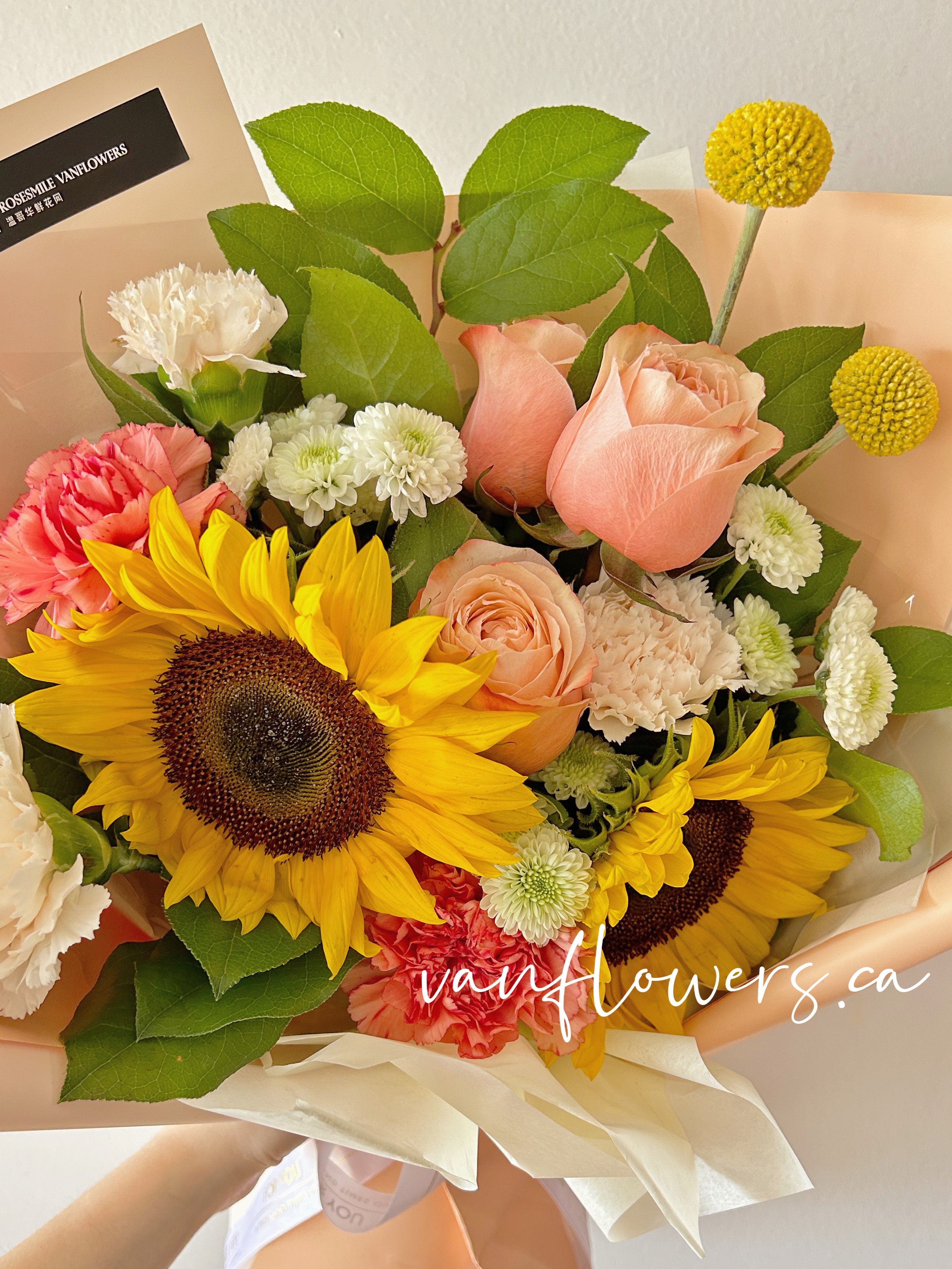 花材:向日葵,香槟/橙色玫瑰,小雏菊,黄金球,银币叶等