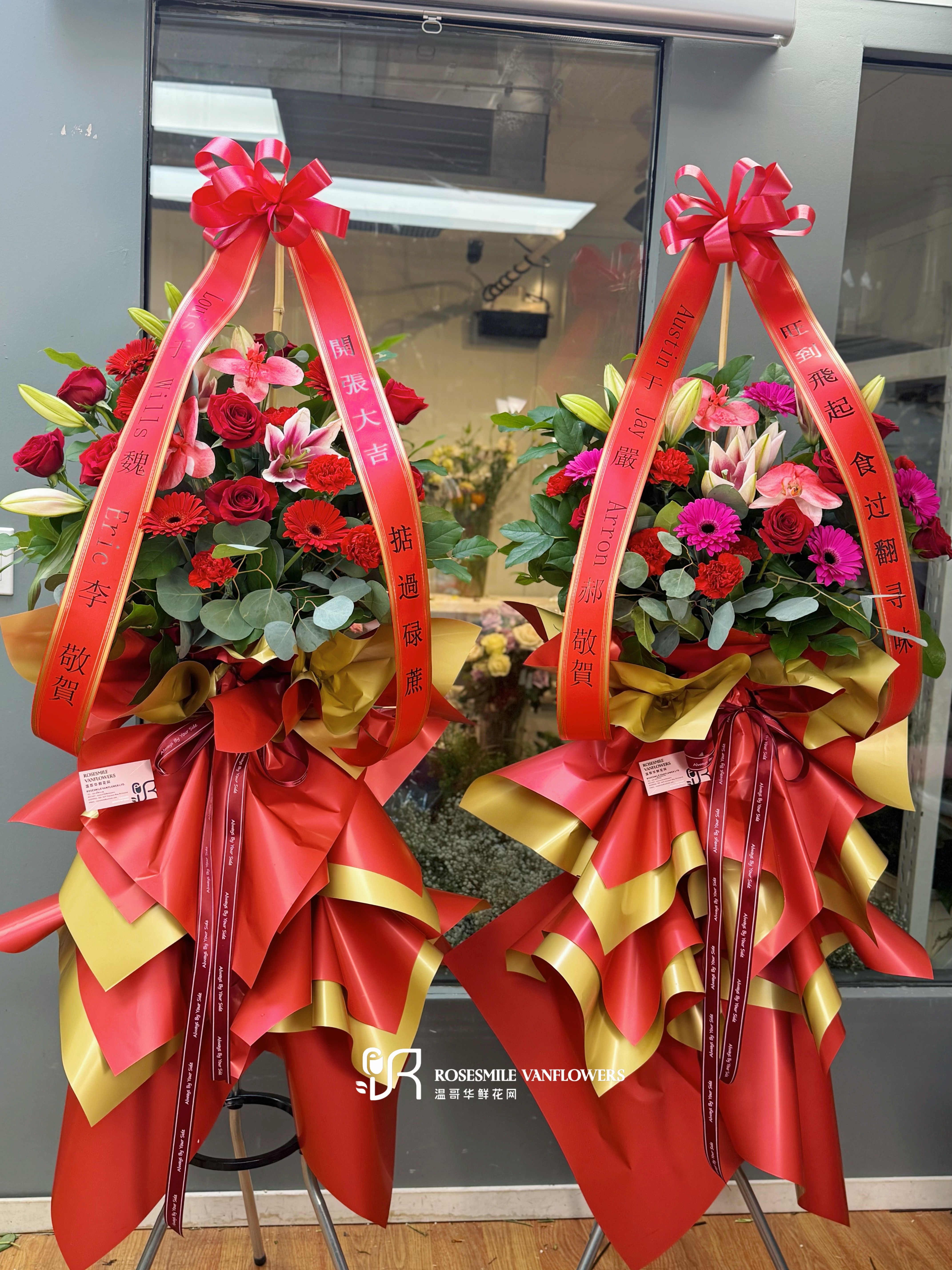 款式:单面观高架花篮 ,红金豪华包装(花架有三角、四角,根据实际库存搭配)