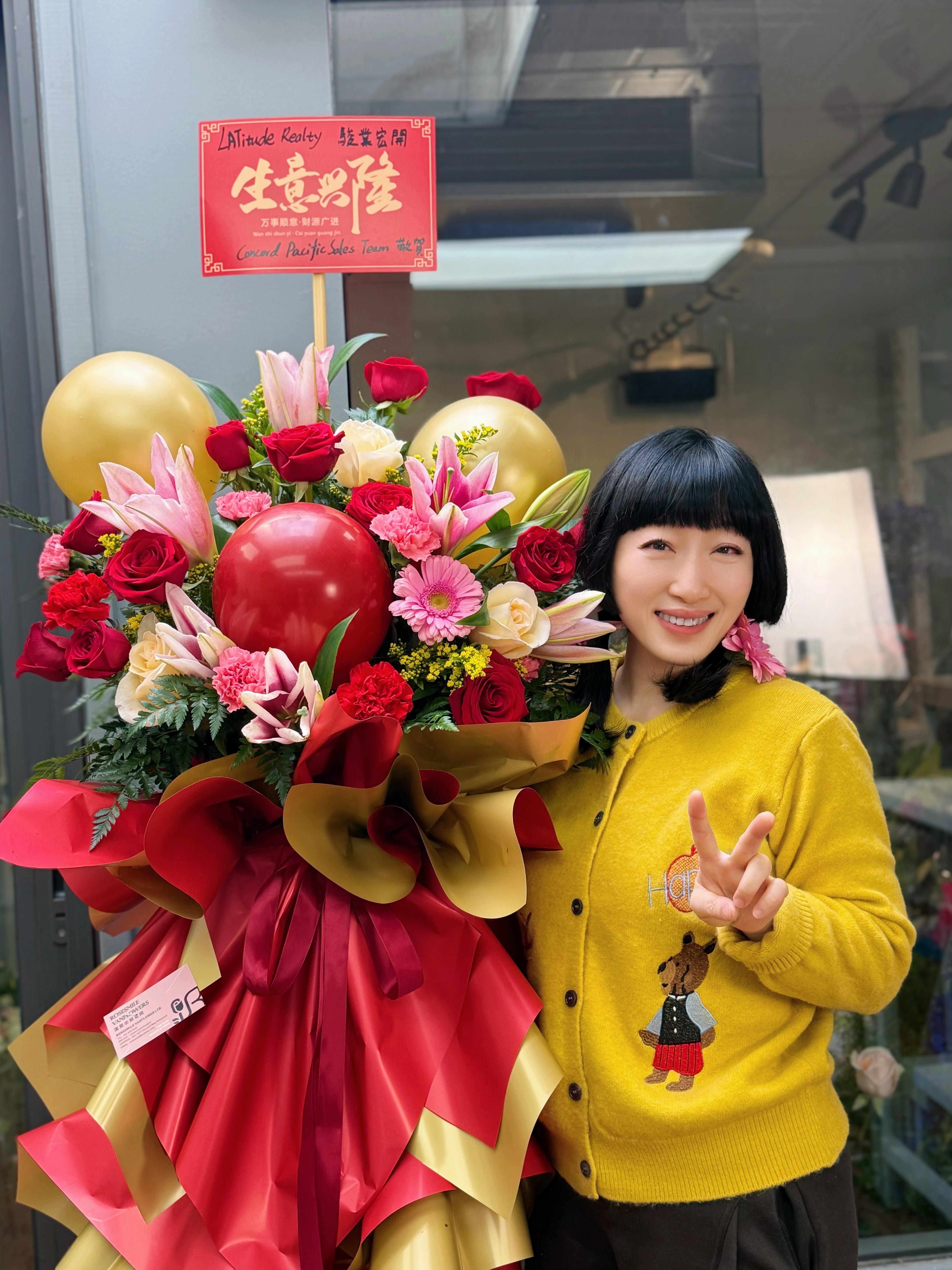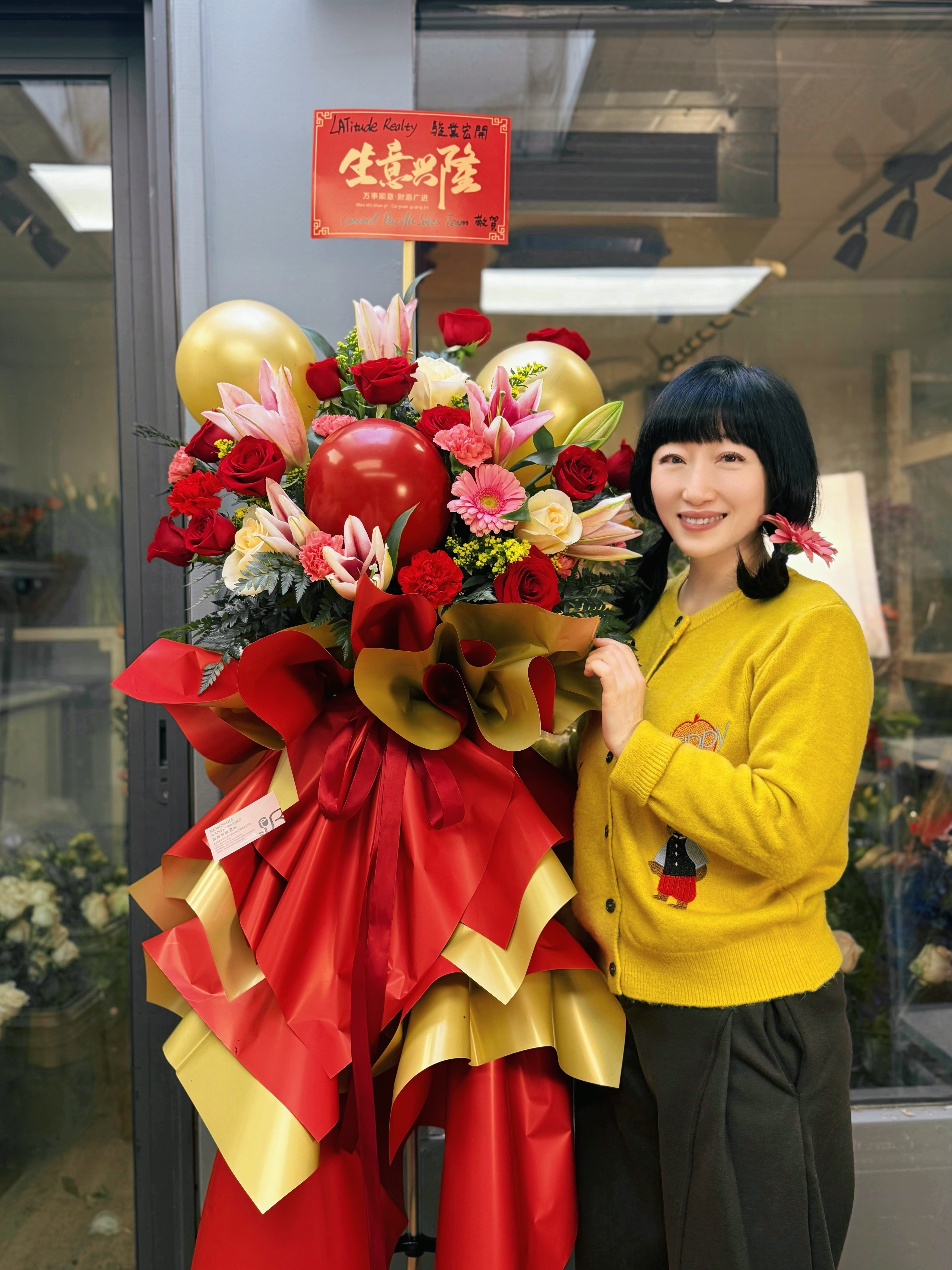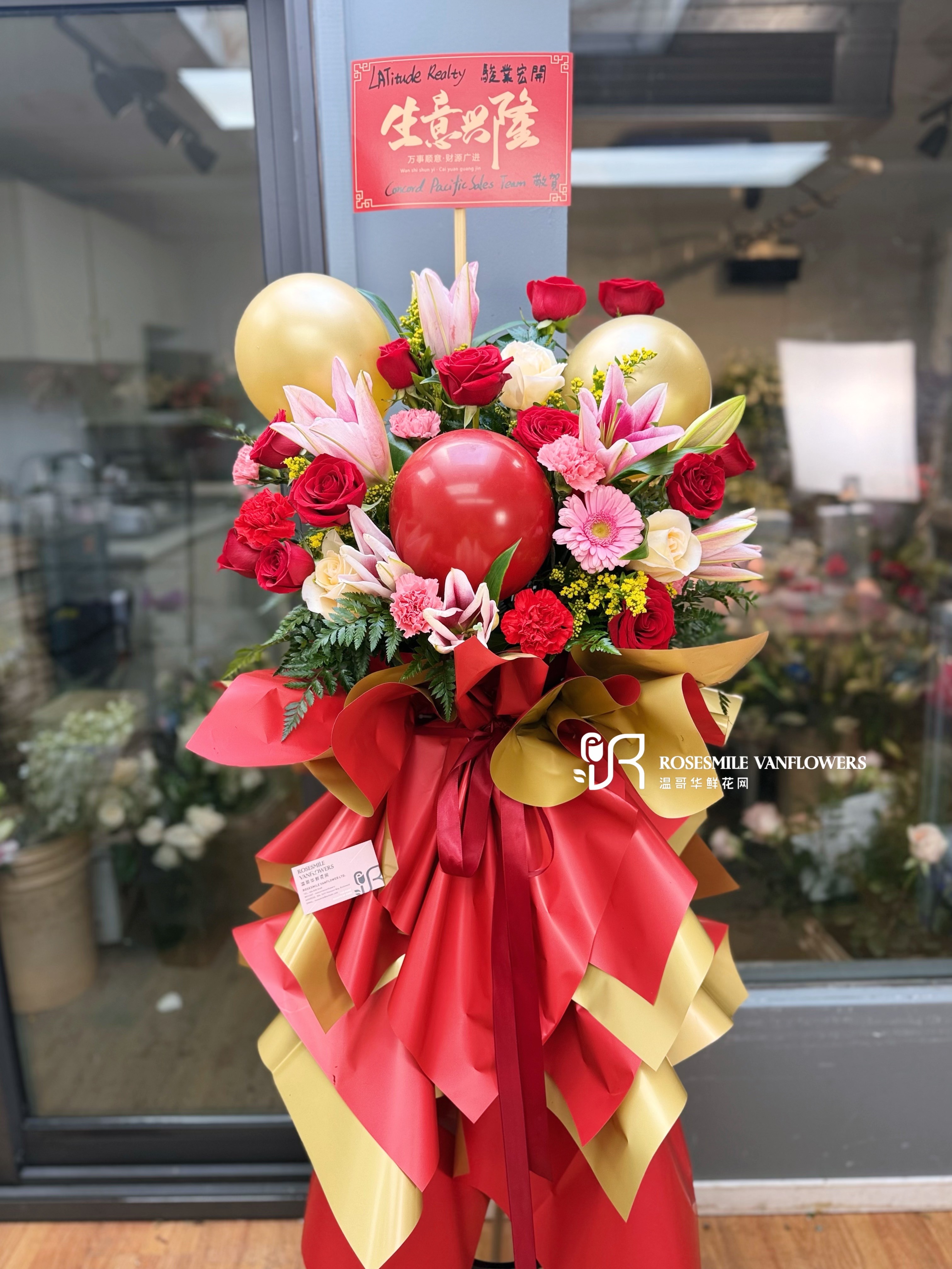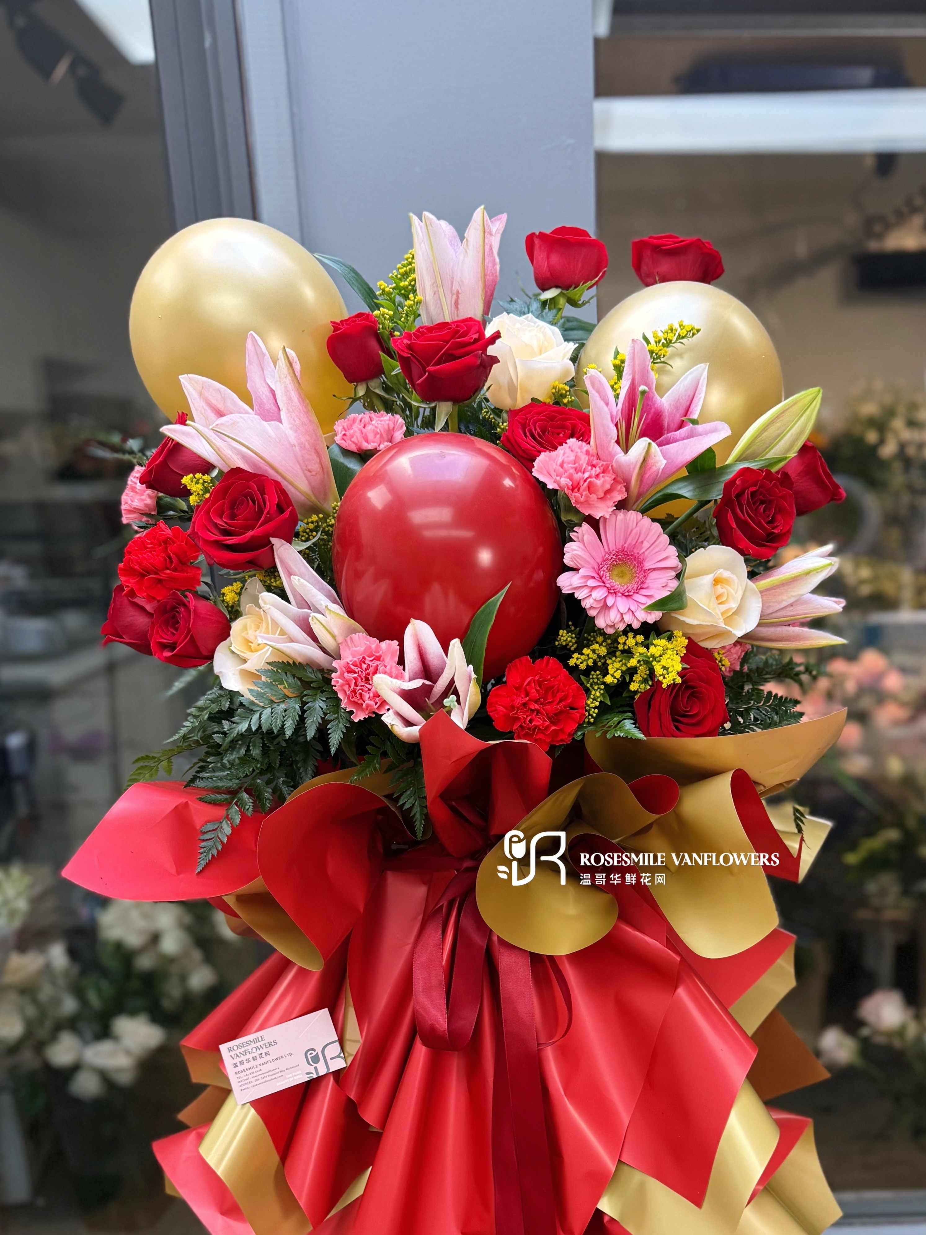 花材:红粉金配色,气球、百合、玫瑰、康乃馨及其他鲜花混搭,叶材点缀,根据库存鲜花合理搭配。